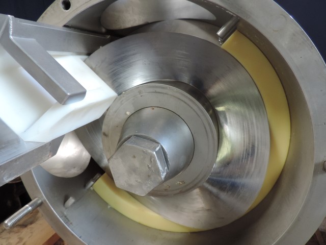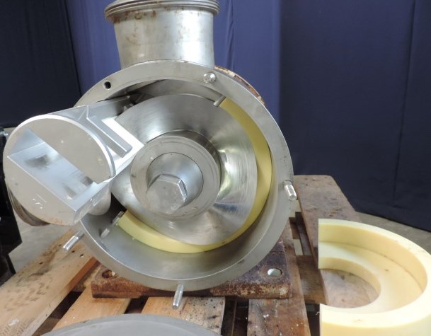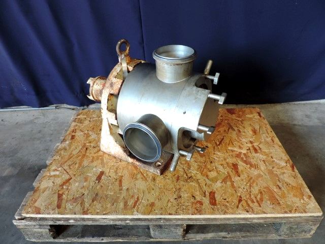 Sine shaped impellor. Flow per revolution: 2,5 ltr. Maximum particle size: 60 mm. Maximum speed: 600 rpm. Shaft diameter: 65 mm. Shaft height: 235 mm. Connections: NW150/NW150. Currently without motor.