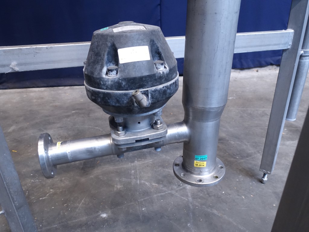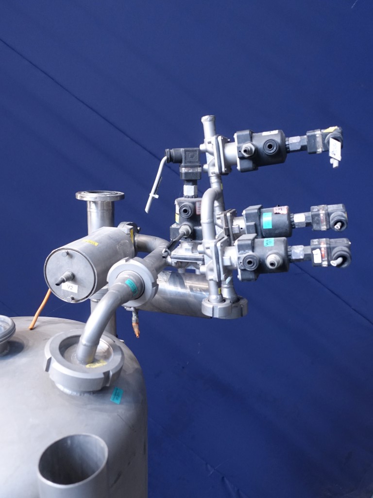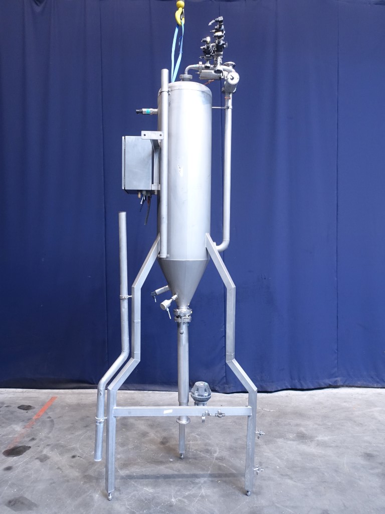 Vertical tank. Nominal volume: 175 liter. Pressure in tank 5 bar. Conical bottom. Product outlet: 3'' flange. Outlet height: 50 cm. Connections for: PT-100 temperature sensor, high and low level sensor. 1 CIP spray bowl. 3 Adjustable feet. Inside dimensions of tank: Ø 40 cm and height: 140 cm. Total dimensions: 130 x 80 x 330 cm.