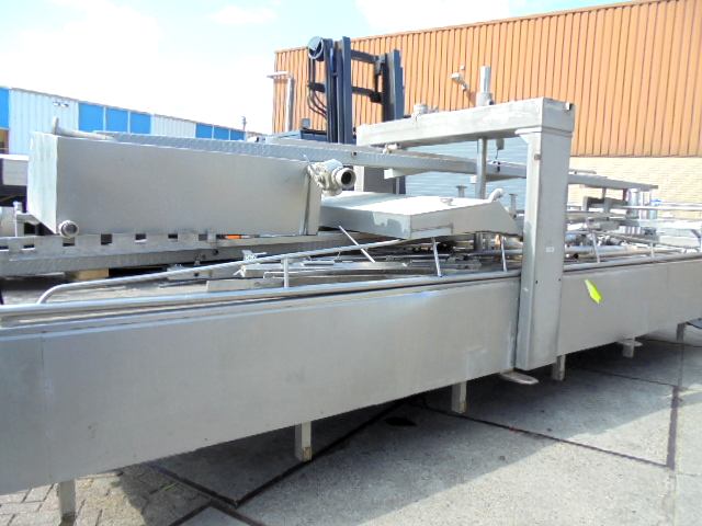 Stainless Steel drainingvessel with top press plate controlled by 1 pneumatic cylinder. Drainage through the side and bottom carpet. Guillotine and cutting knives, currently set on 6 pieces/stroke. Volume ± 6.000 litre. Inside dimensions: 6,75 x 1,75 x 0,50 meter. Including frames on the side to stand on. Total dimensions with frames: ± 8,00 x 2,80 x 4,50 meter.
