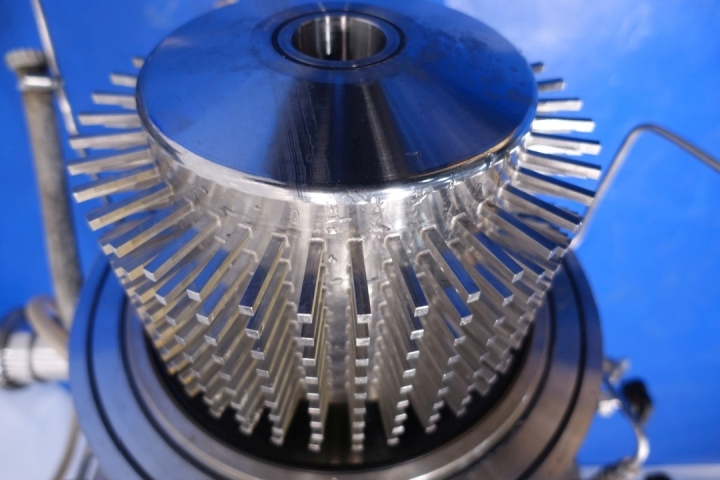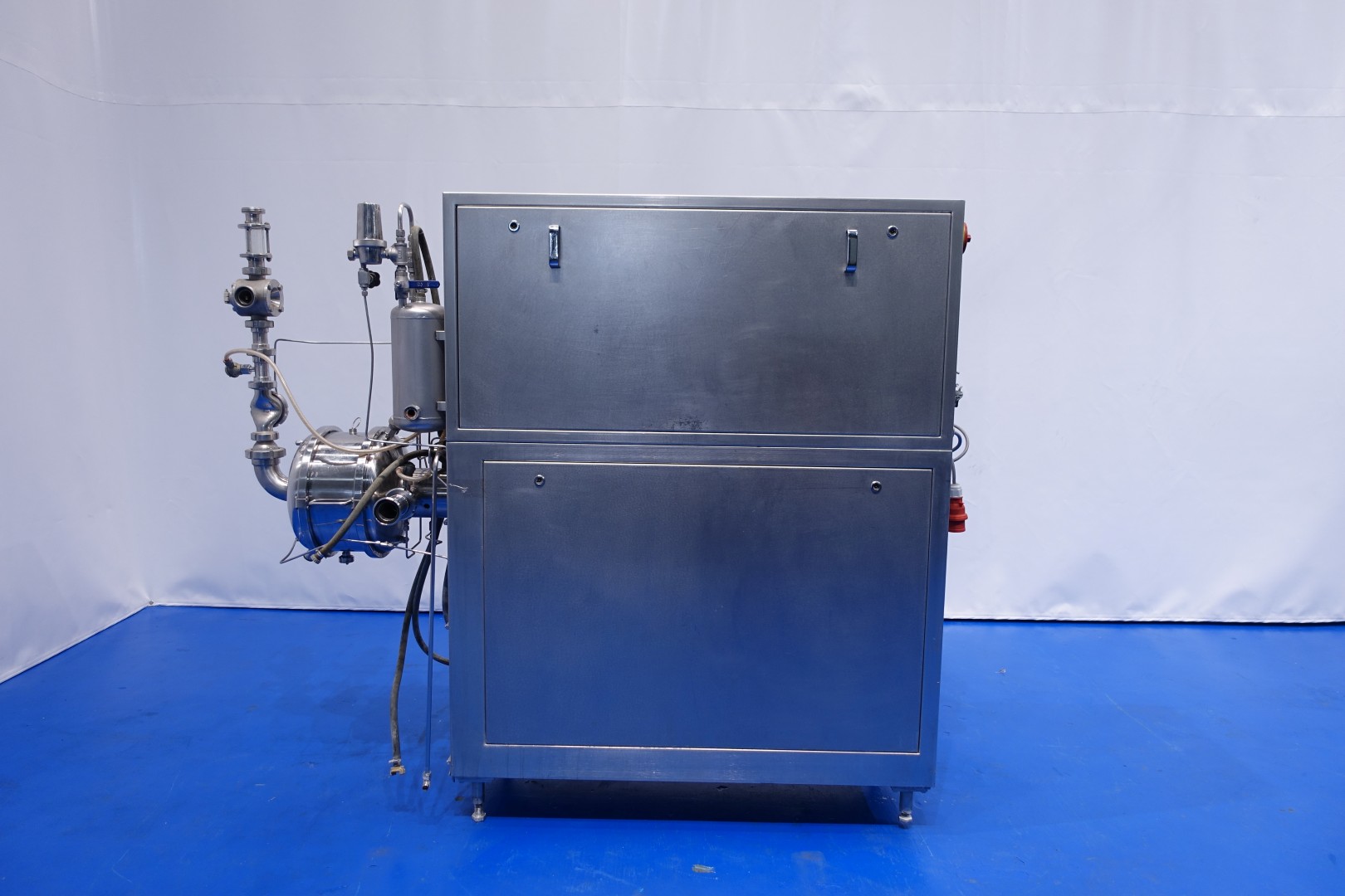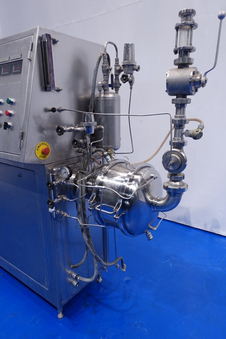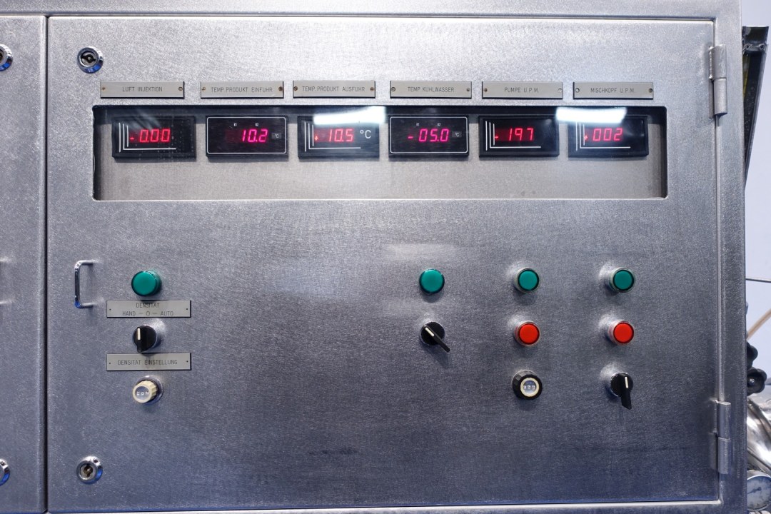 Mondomix aerator. Aseptic design continuous aerating system for the dairy industry and can also be used for bakery and confectionary. Double jacketed head with counter pressure valve and 3 way valve on outlet. Main motor 11 kW variable speed 120-600rpm. Lenze frequency converter for feed pump, temperature sensor on inlet/outlet water filter, water condensate unit for aseptic seal water. Gas control valve and gas flow indicator. Stator Ø 192 mm with 360 pins - cilinder Ø 265 mm with 360-2 = 358 pins. Control panel with relays. Connections in: 2,5" Din - out: 2" Din. Total dimensions: 215x68x175 (lxwxh) cm - weight: 736 kg.