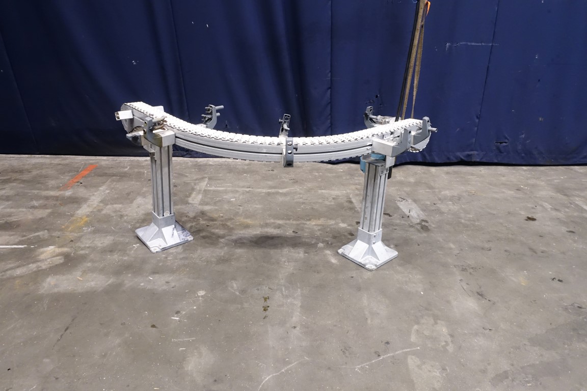 Chain conveyor. Effective Belt: 210 x 10 cm. Motor: 0,37 kW - 1410 rpm. Horizontal. 90° corner. Total dimensions: 210 x 100 x 83 cm.