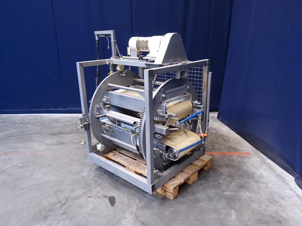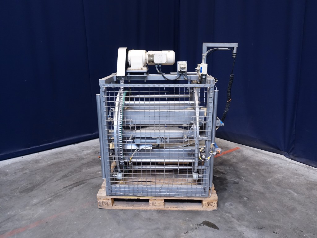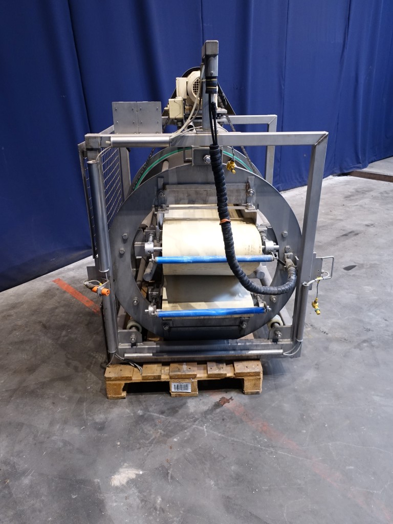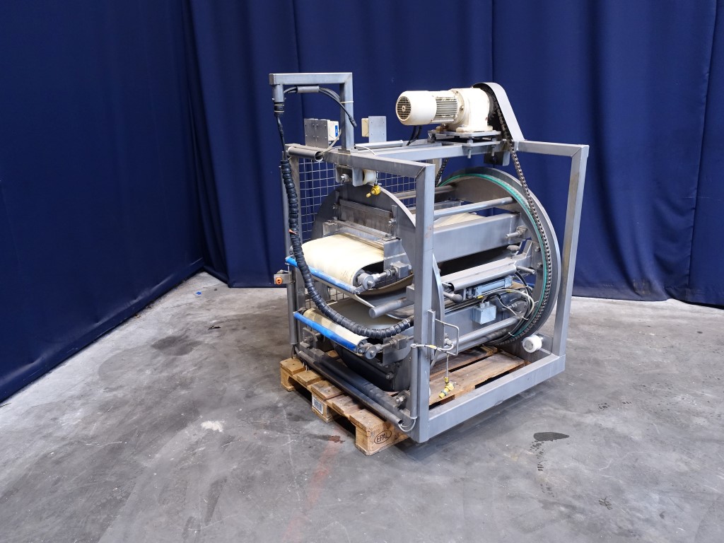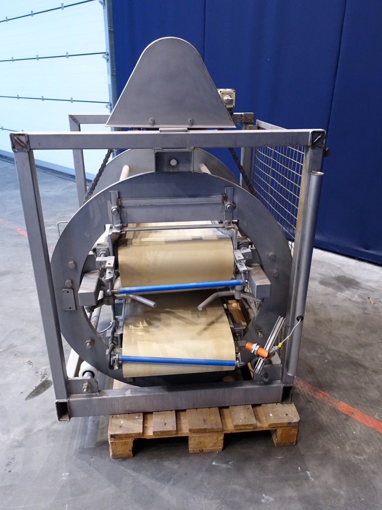 Cheese turning device. Max cheese size: 120 x 42 x 24 cm. Conveyor size: 42 x 120 cm. Rotating: 180°. Motor: 0,75 kW - 2,2 A - 220 rpm. Without rol and drivemotor for upper conveyor. Total dimensions: 130 x 150 x 160 cm.