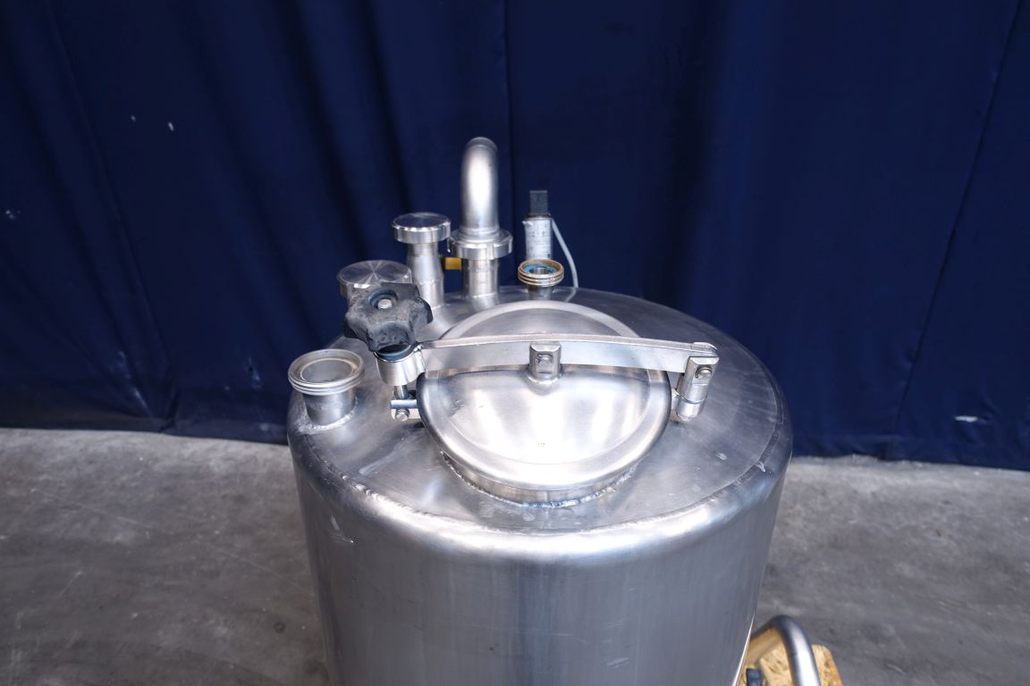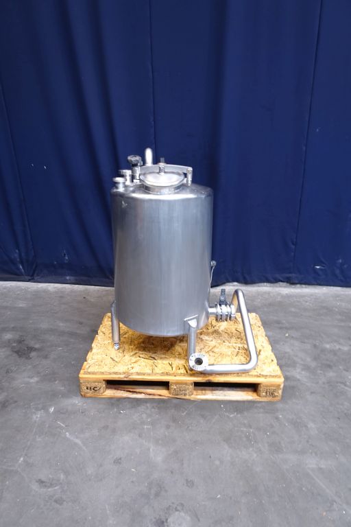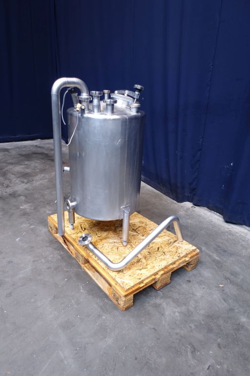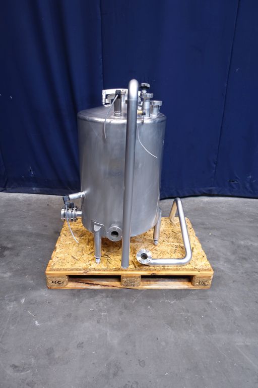Closed leveltank. Manhole in top 20 cm. Flat to the side. Product outlet, DN65 DIN, outlet height: 25 cm. Manual butterfly valve. Connectors for high and low level @30 cm. CIP spray bowl. 3 Adjustable feet. Inside dimensions of tank diameter 58 cm and height 75 cm. Total dimensions: 75 x 80 x 130 cm.