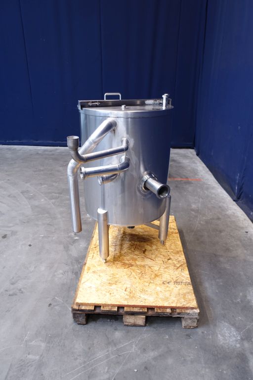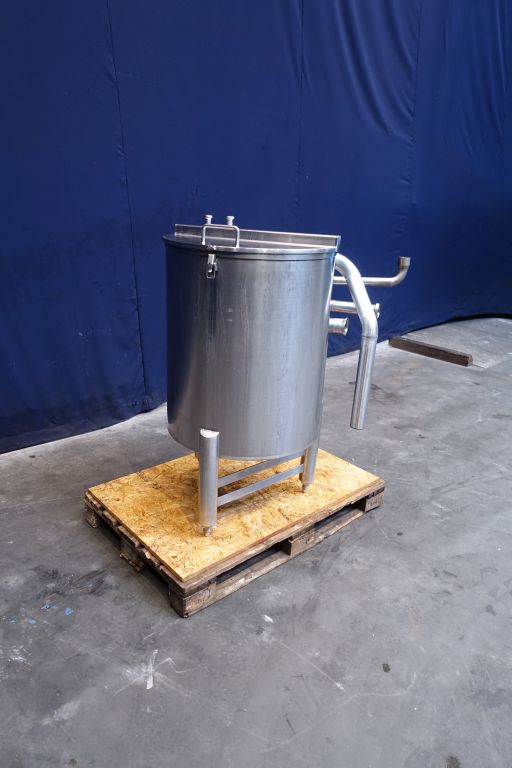 Half open top with cover leveltank. Conical. Product outlet 1,5'' SMS, outlet height: 28 cm. 3 Adjustable feet. Inside dimensions of tank diameter 62,5 cm and height 75 cm. Total dimensions: 90 x 110 x 120 cm.