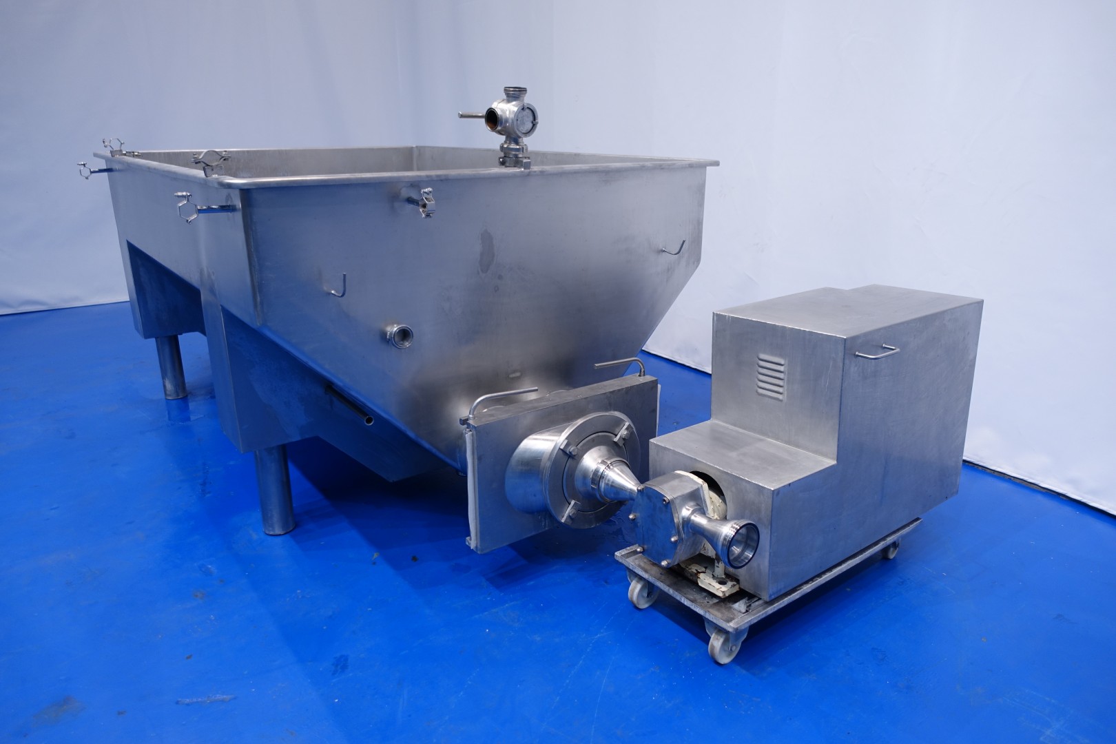 Open butter buffer tank (butter silo). 2 Augers with 1 motor with reductor. Motor 2,2 kW - 5,4 A - 950 rpm - 50 Hz. Reduction 1/30. Connections, butter outfeed 1 x 4" SMS for butterpump. Length of the augers +/- 246 cm. Total outside dimensions: 325x170x144 (lxwxh) cm. Weight: 886 kg. With simon Freres oscillating outfeed butterpump (STN15692) model S150, 3kW- 940rpm/n2: 67rpm, Gummi lobe, connections 4", SMS (last picture), weight pump 274kg