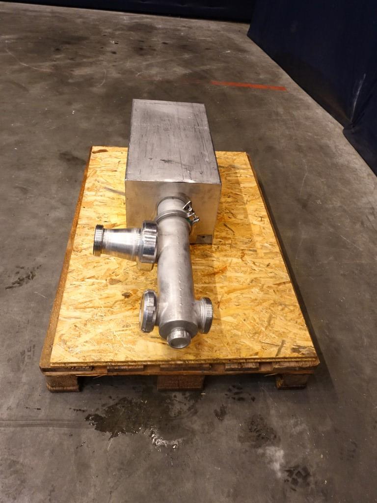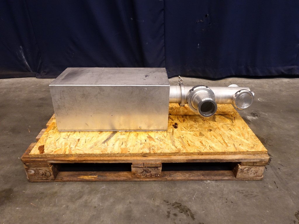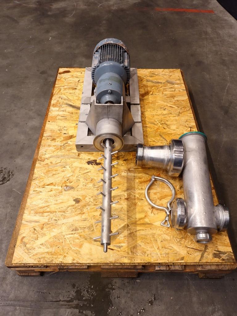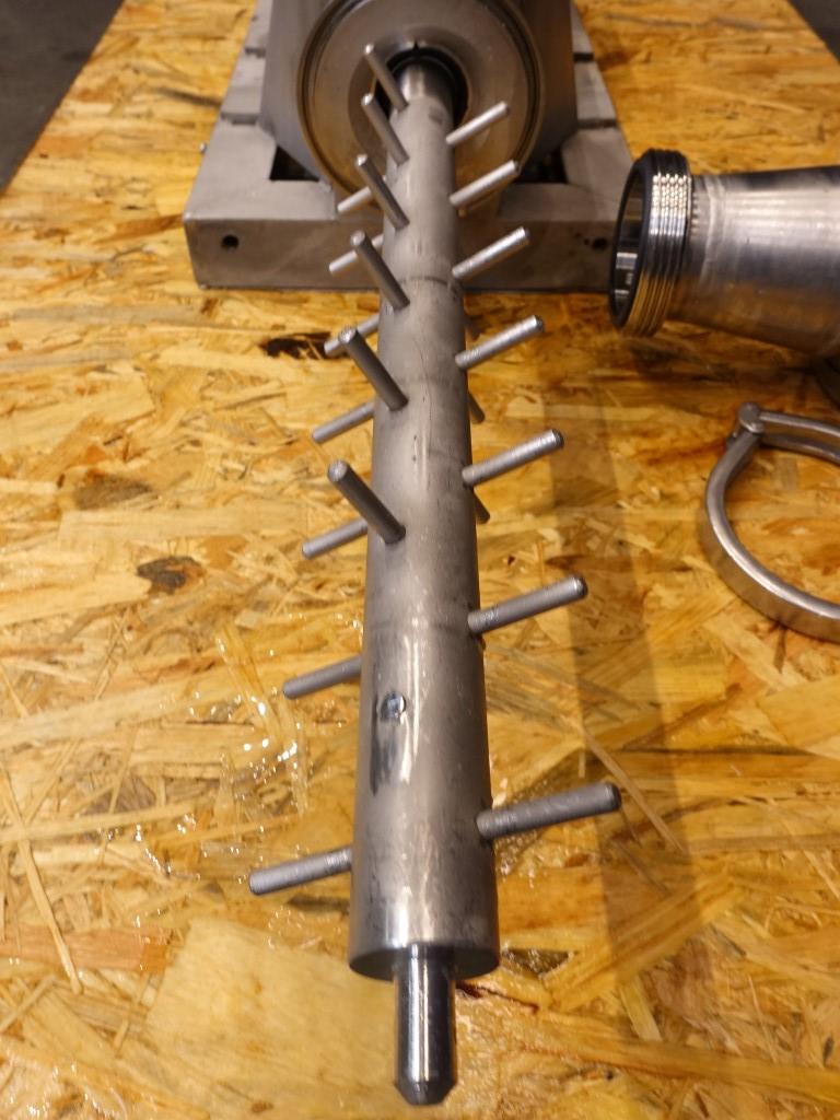 Pin mixer. Used for butter as a inline mixer on the infeed of a butter packing machine of 1.000 - 2.000 kg/h. Motor power: 1,5 kW - 3,65 A - n1: 1420 rpm - n2: 357 rpm. 28 pins on the (30 mm) shaft 24 pins on the (98 mm) housing. Lenght: 40 cm.