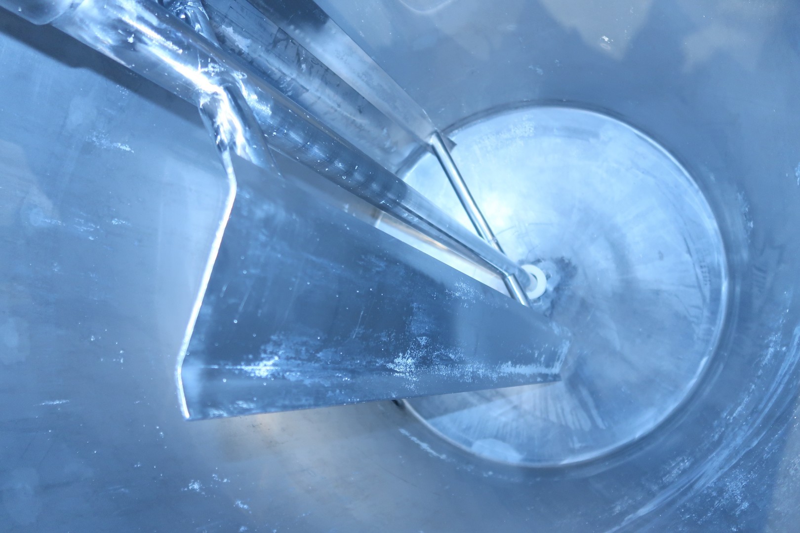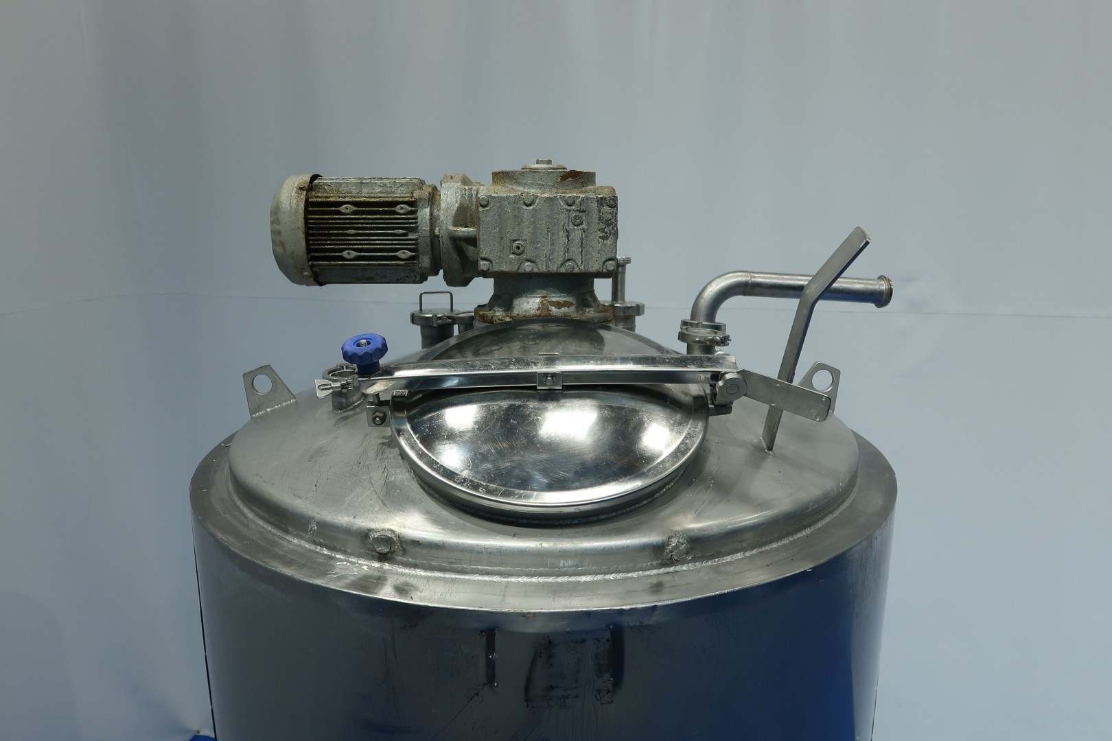 Double jacketed process tank. Top driven Fence-shaped agitator, with bottom bearing. Motor power: 2,2 kW - 4,7 A - n1: 1.425 rpm - i: 97 - n2: 15 rpm. Pressure in jacket: 3 bar. Insulated side and bottom. Product outlet 2" Tryclamp and outlet height: 50 cm. Including pneumatic and manual butterfly outlet valve. Radar level sensor in top make: E&H , type FMR20-38F0/0 , pressure transmitter, breather. 1 CIP spray bowl. Manhole in top, round 40 cm with matching funnel to feed in ingredients. Filter on on outlet. 3 Adjustable feet. Inside dimensions of tank: Ø 108 cm and cylindrical height 164 cm. Total dimensions: 140x140x290 (lxwxh) cm - weight: 680 kg.