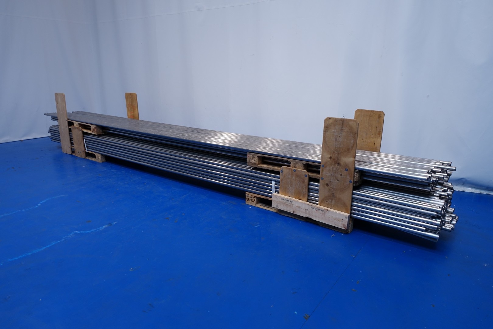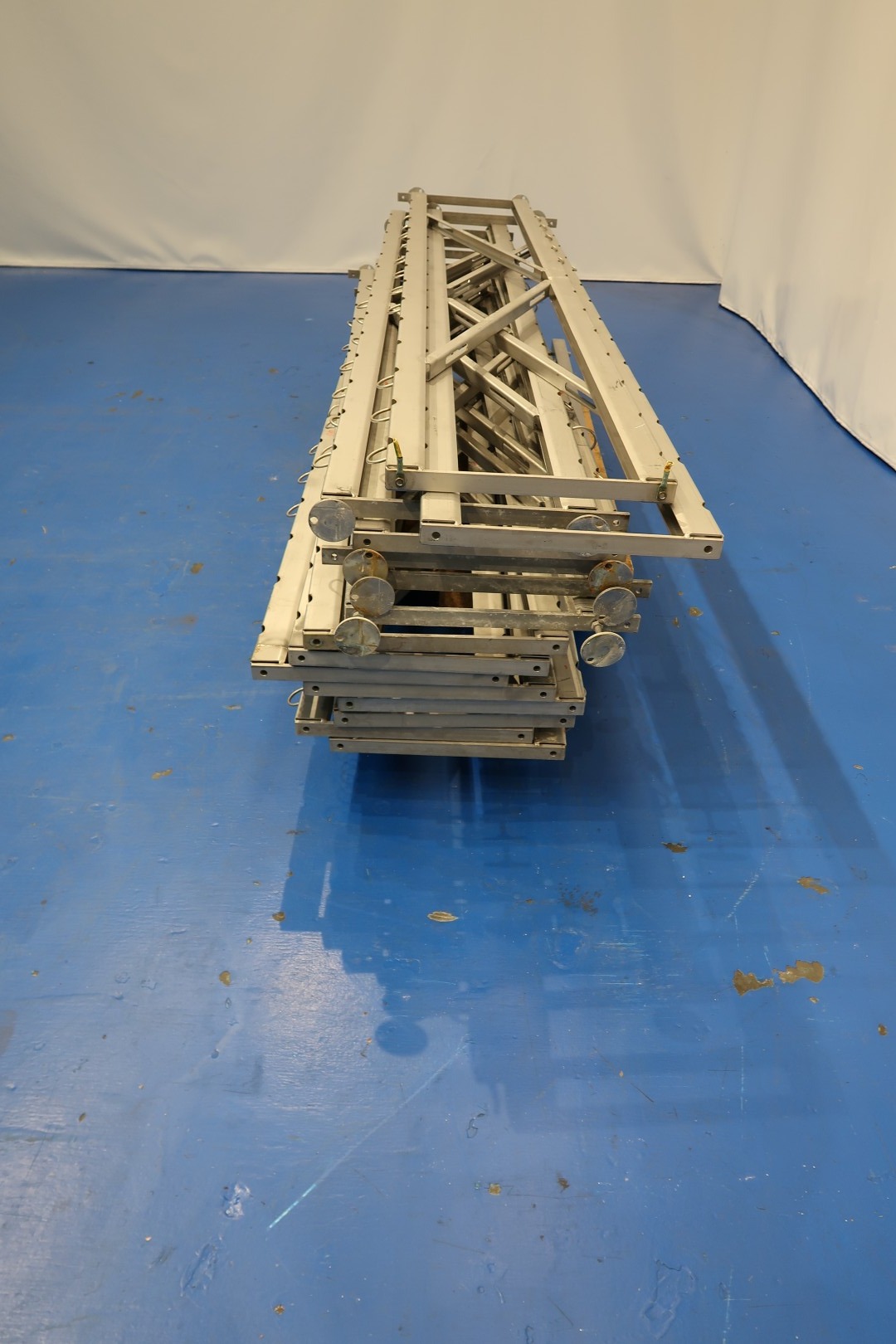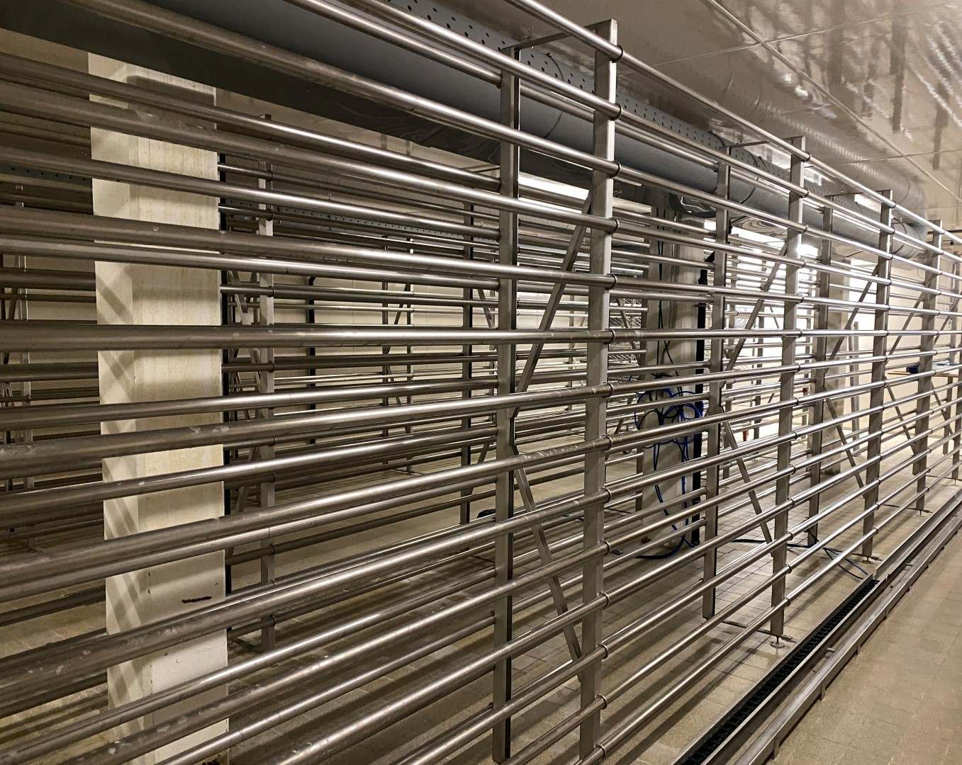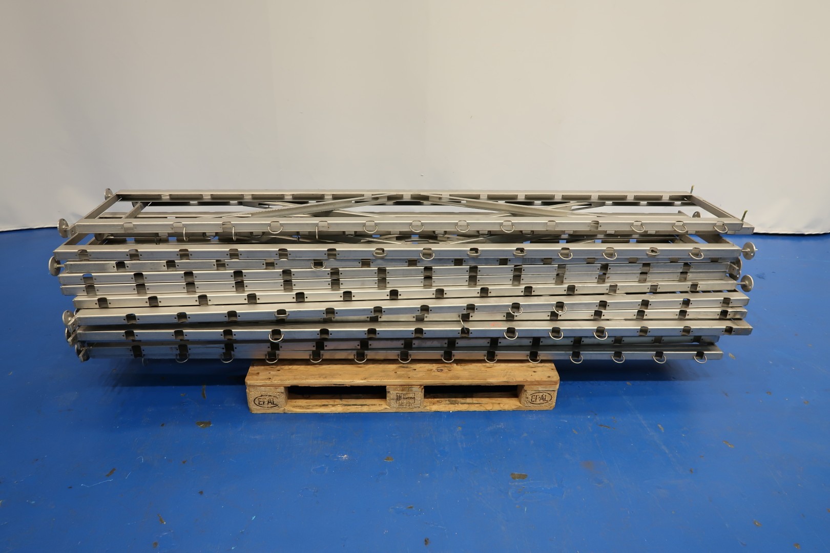 Cheese storage rack system. Previously used for cheese shelves of 105x31,5 cm. 14 layers inbetween rack uprights or per bay. 32 rack uprights available with beams/racks and mounting material. Was placed in 4 rows with 7 bays. Currently dismantled, can easily be assembled and/or adjusted to desired conditions (between certain parameters). Originally placed in storage room with automatic cheese storage system (STN15798). Other cheese storage rack system under STN15799 also available.