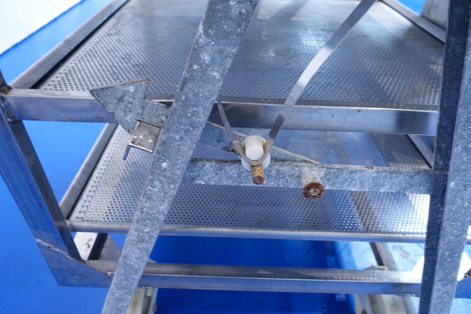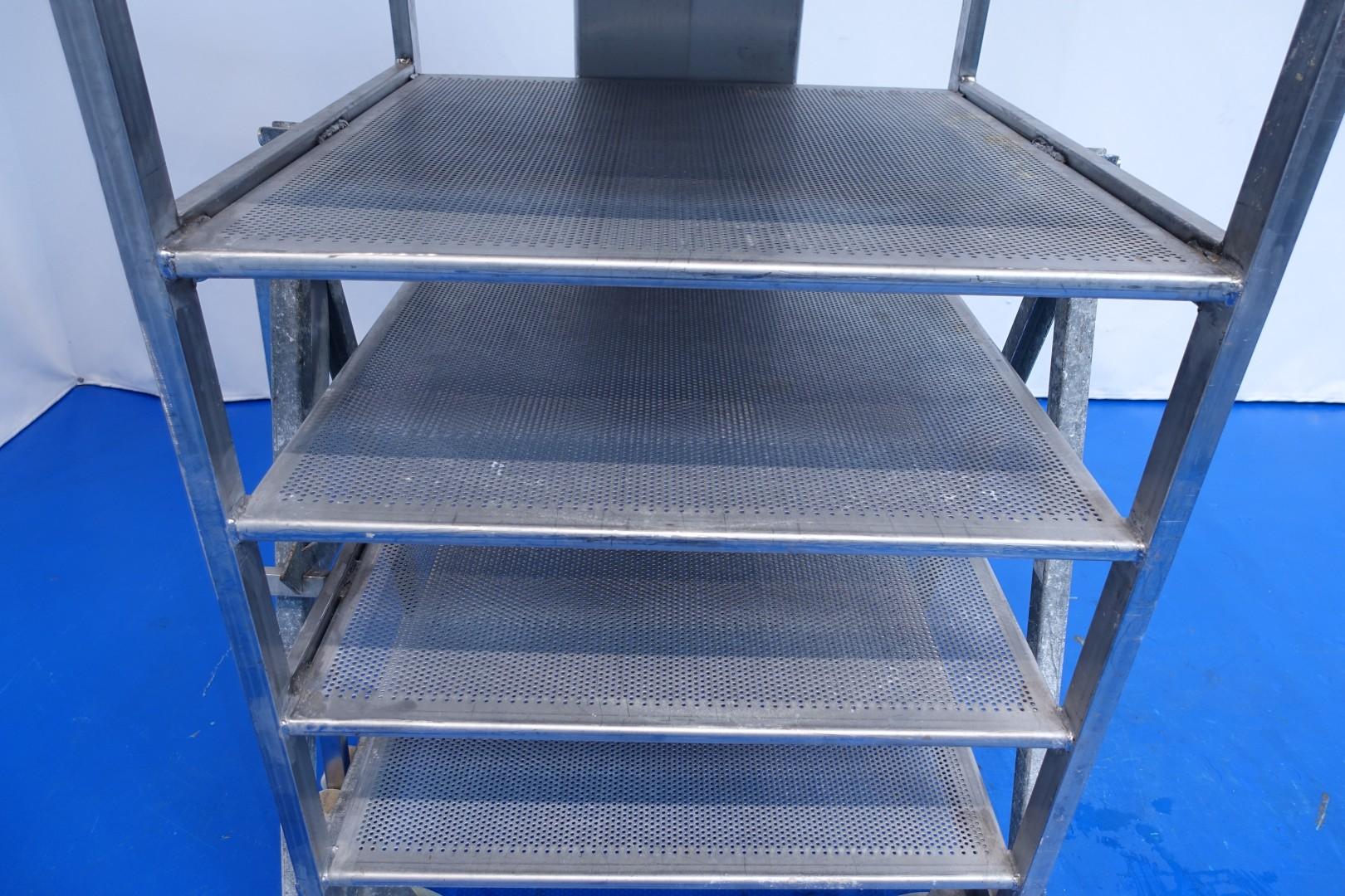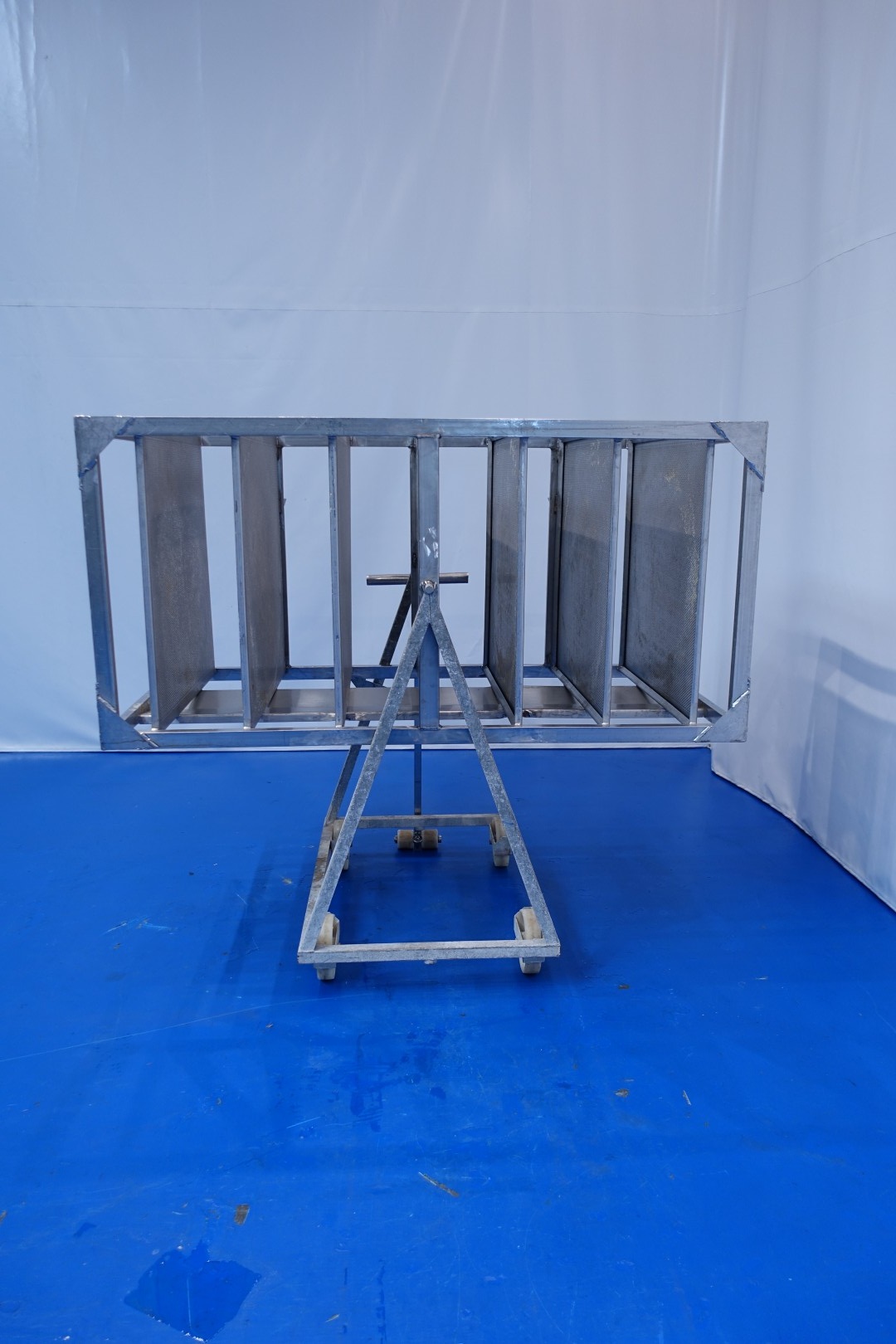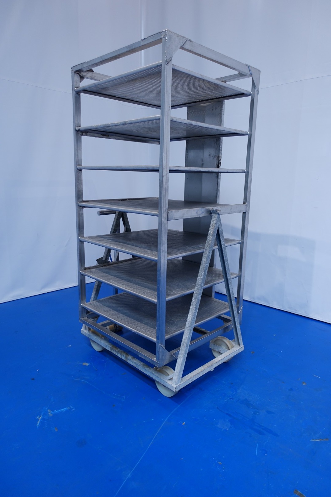 Cheese turning device on mobile steel frame, square design. Previously used for Emmertaler cheeses. 6 Pieces can be placed inside. Each plate with perforated holes. Max cheese size ca. Ø 85 cm - space between layers 25 cm. With locking meachanism. In total 1 complete set with SS beam for easy moving. Dimensions: 95x94x222 (lxwxh) cm - weight: 206 kg per piece.