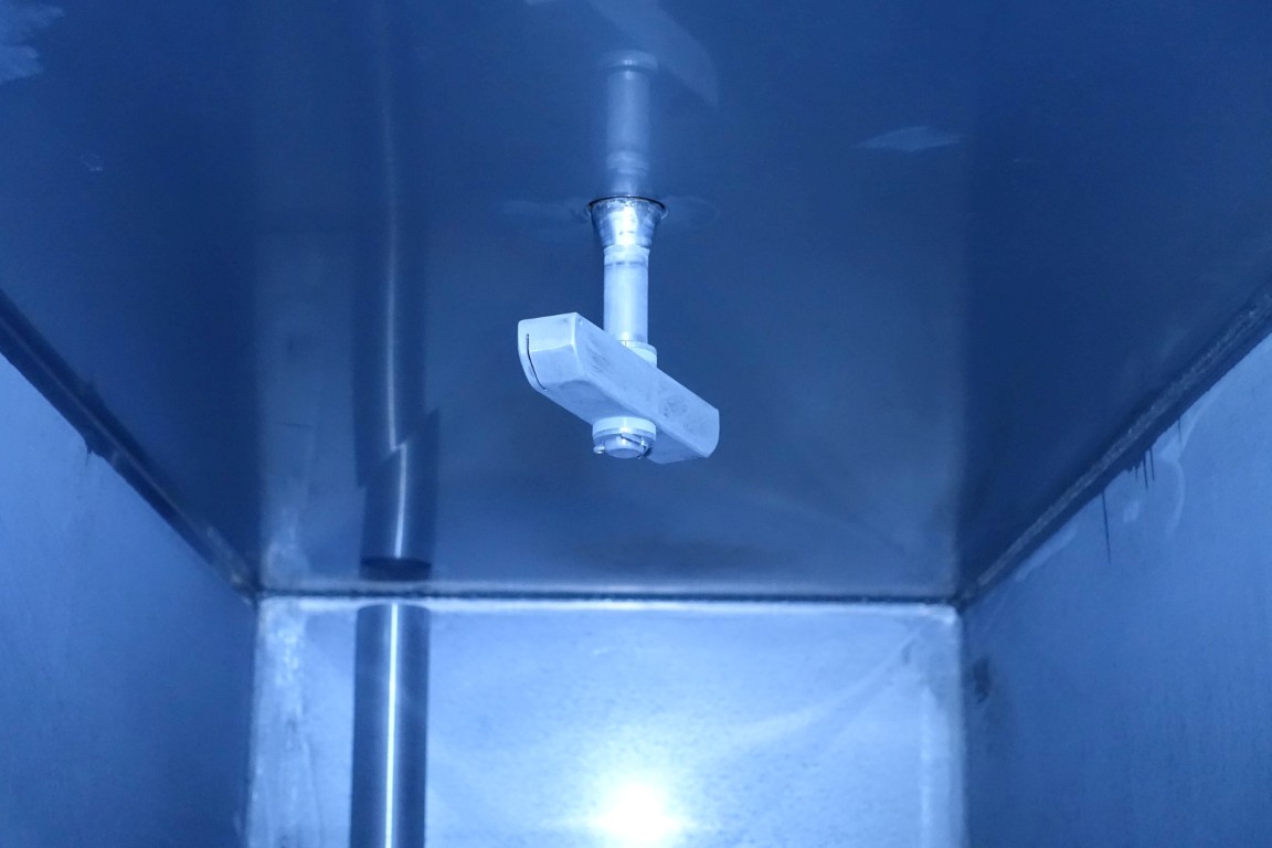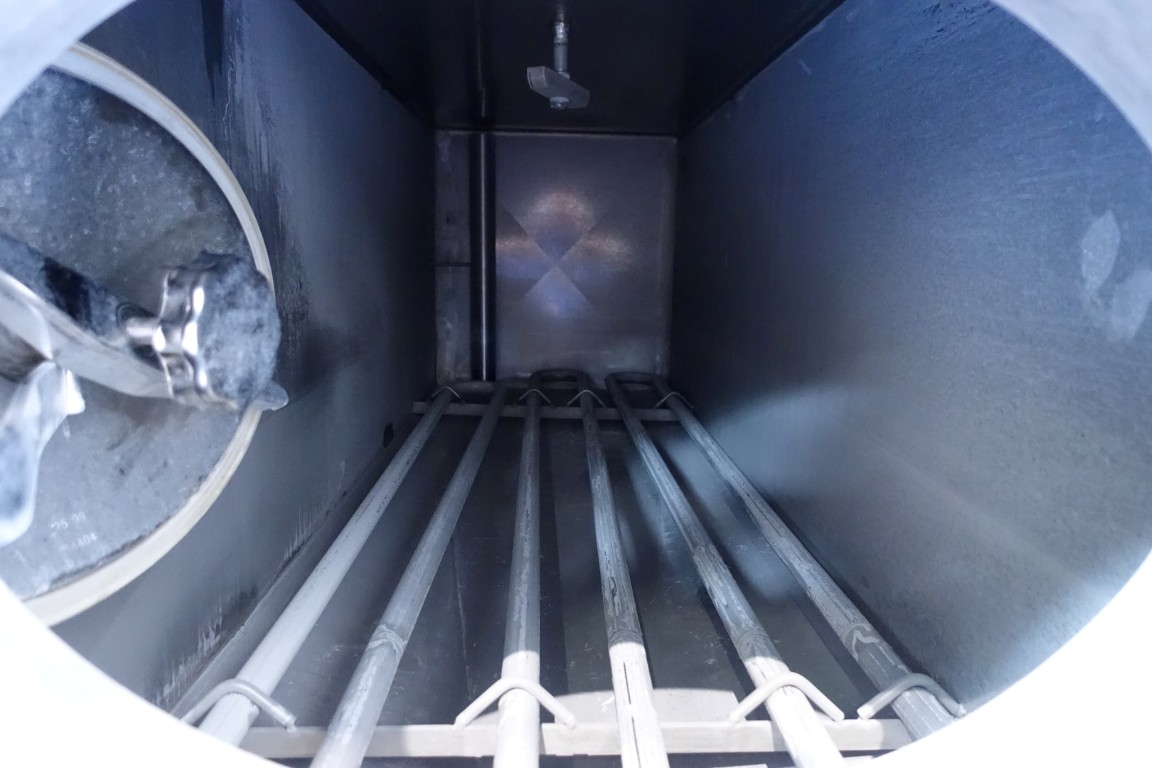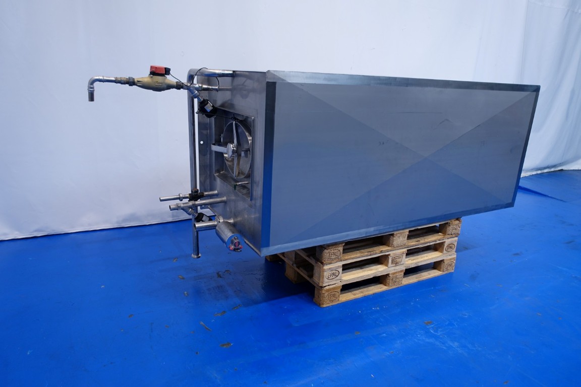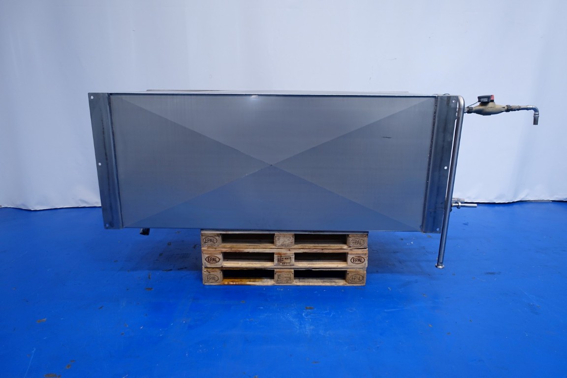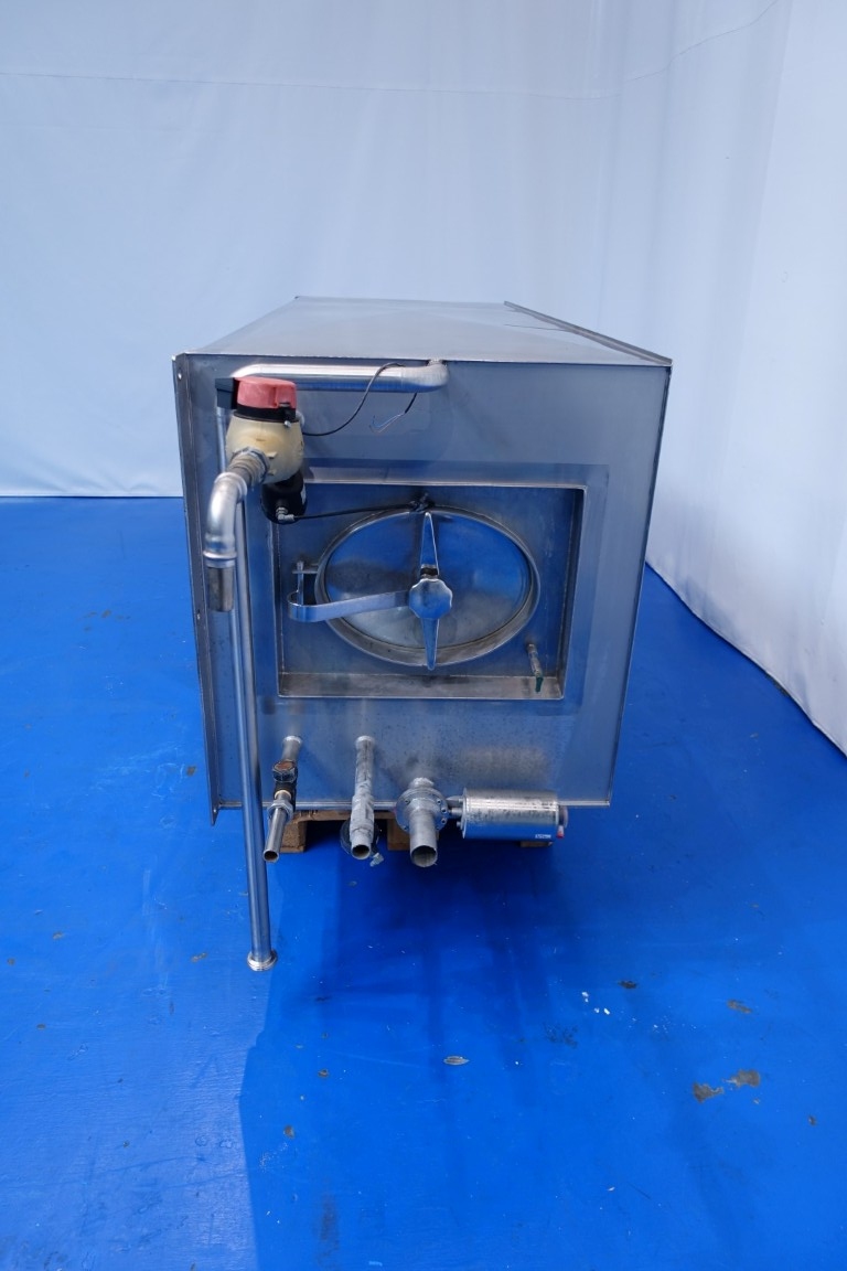 Water heater, Insulated rectangular tank with spiral. Used as heater of water by circulation under pressure hotwater through a spiral and circulation of (sanitairy) water without pressure for usage for in the factory or double jacket of curd-vat. With wall mounting facility on one side. With 1 x Cip boll for cleaning the tank. Oval manhole 43x30 cm at front/back-side. Inner dimensions 70x79x210 cm. Capacity ca. 1.000 liter. With temperature sensor. Piping connections: 1 x in and 1 x out for spiral, 1 x to CIP bol, 1 x in and 2 x out of which 1 with butterfly valve. 1 x Watermeter. Outer dimensions: 105x85x297 cm - weight: 375 kg.