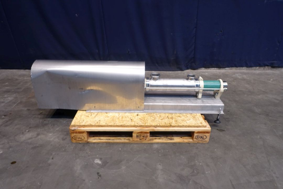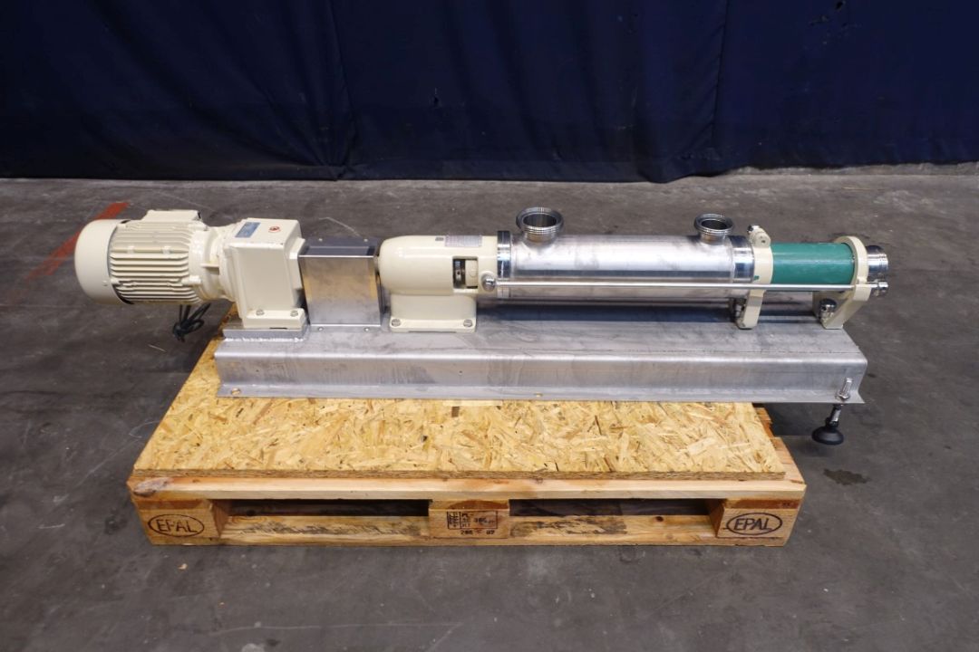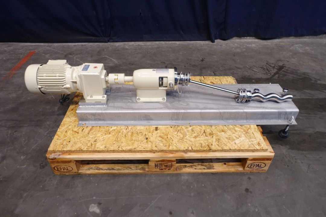 Screw / mono pump. Stator diameter 40 mm. Stator length 25 cm. Current motor: 2,2 kW - n1 2820 rpm - n2 = 571 rpm. Steel frame mounted. Connections: DN65/DN40.