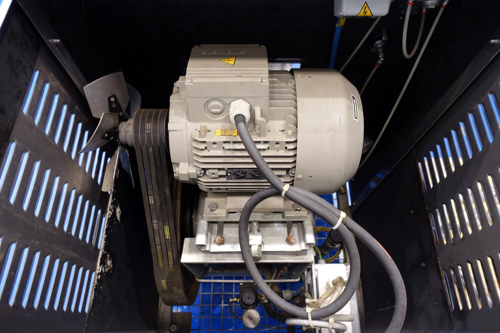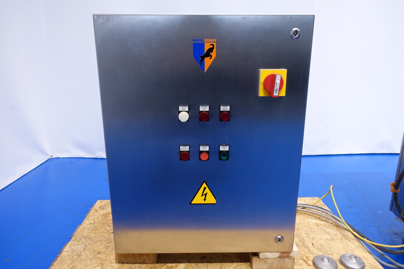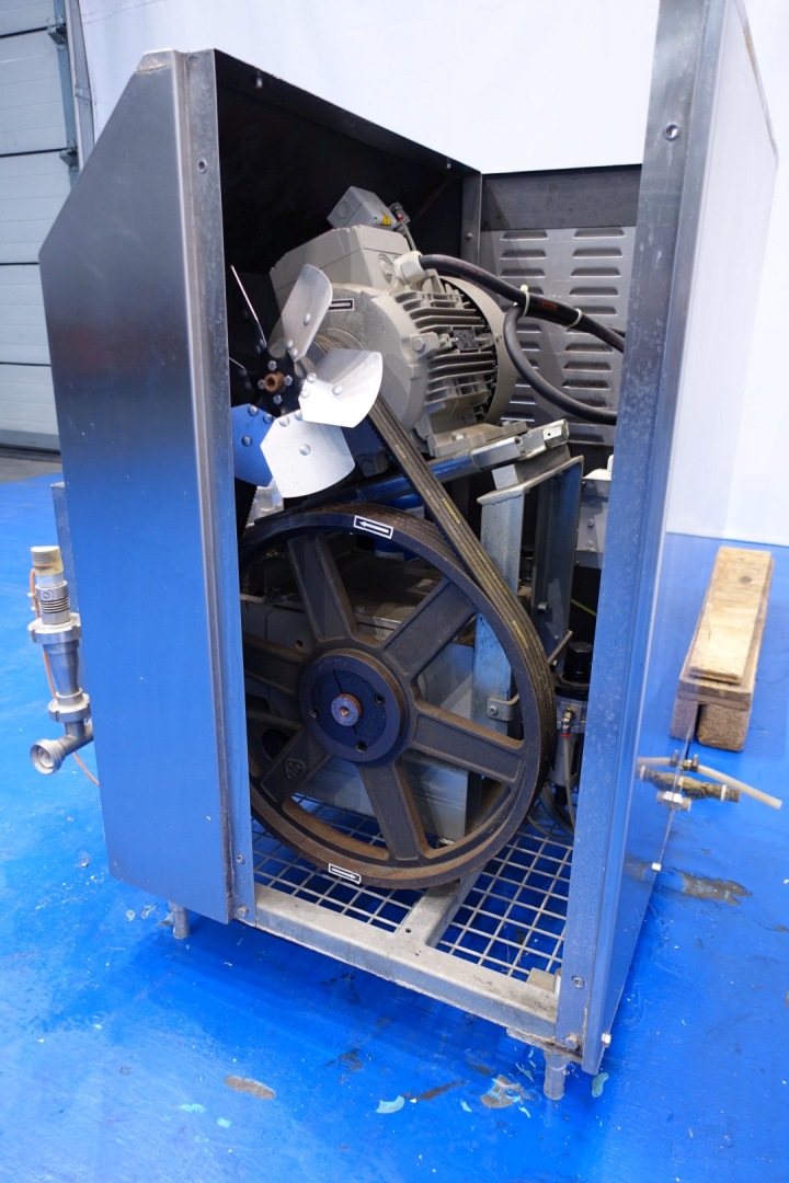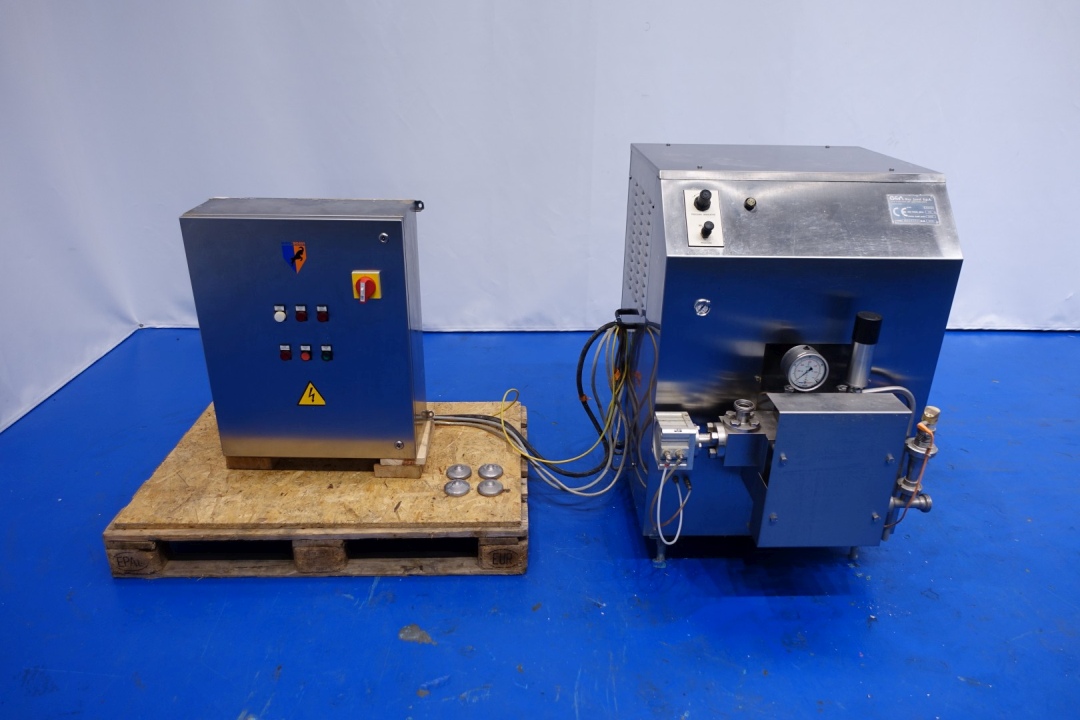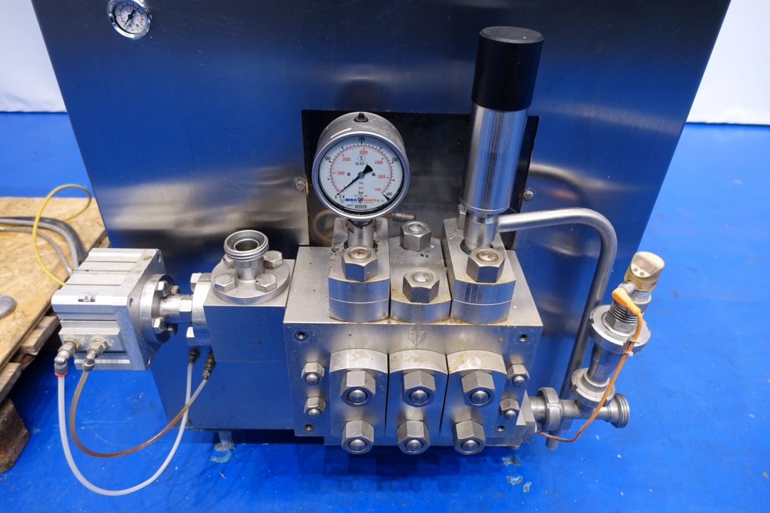High pressure homogeniser. 3 Pistons, 1 stage, with manual pressure control. Pistons, pisotn diameter 30 mm and stroke: ca. 55 mm. Stainless steel cladded. Current motor power: 6,0 kW - 12 A - 50 hz - 400 V - 3 phase. Maximum pressure in current configuration with this motor up to 250bar. Free standing control panel (to be wall mounted). Operating hours on meter: 1.202. Including electronic pressur transmitter on inlet, pressure indicator manometer, overpressure valve, flowswitch (and manual valve) on cooling water. Total dimensions: 103x85x114 (lxwxh) cm - weight: 440 kg.