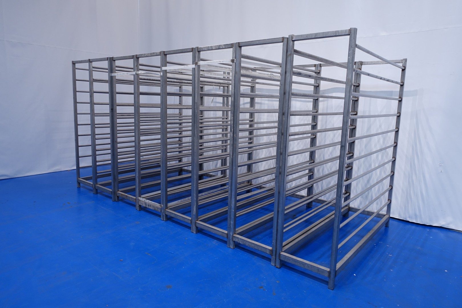 Cheese storage racking system, Holding system to put wooden or plastic shelves in. For cheese maturing room of apprrox 2200 shelves of 105x31,5 cm. Amount of layers per rack: 10, height between layers 15 cm, current length between uprights ca. 186 cm, depth: 47-55 cm. Consisting out of: 8 complete racks and 14 uprights. Weight per rack ca. 90 kg - total weight of all equipment: 1.862 kg. Other cheese storage rack system under STN15836 also available.