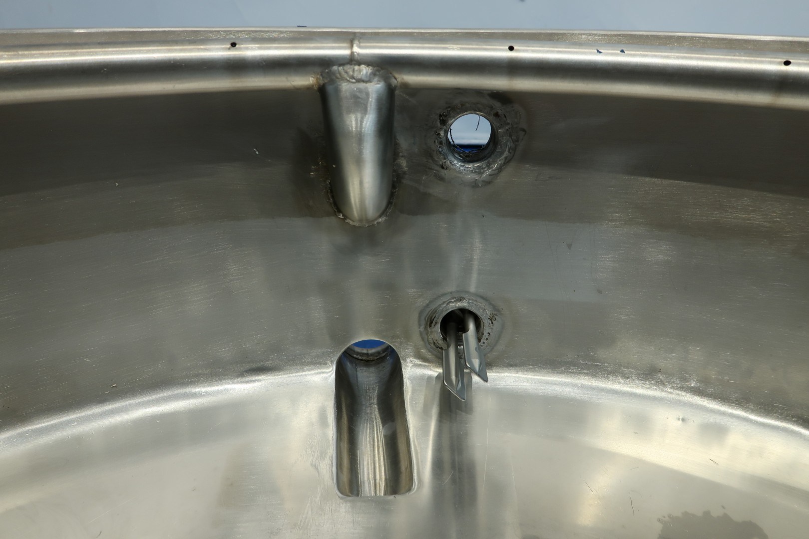 Collection tank, extra low to be placed under a filling machine, press or separator. Previously used to collect pressing whey. With 2 x connection for level sensor (1 included). Diameter 99,5 cm - height: 22 cm. 1 x CIP pipe internally round with holes for cleaning. Connections: 1x 3" Din - 1x 2,5" Din - 1 x 2" Din. Total dimensions: 141x111x43 (lxwxh) cm - weight: 50 kg.