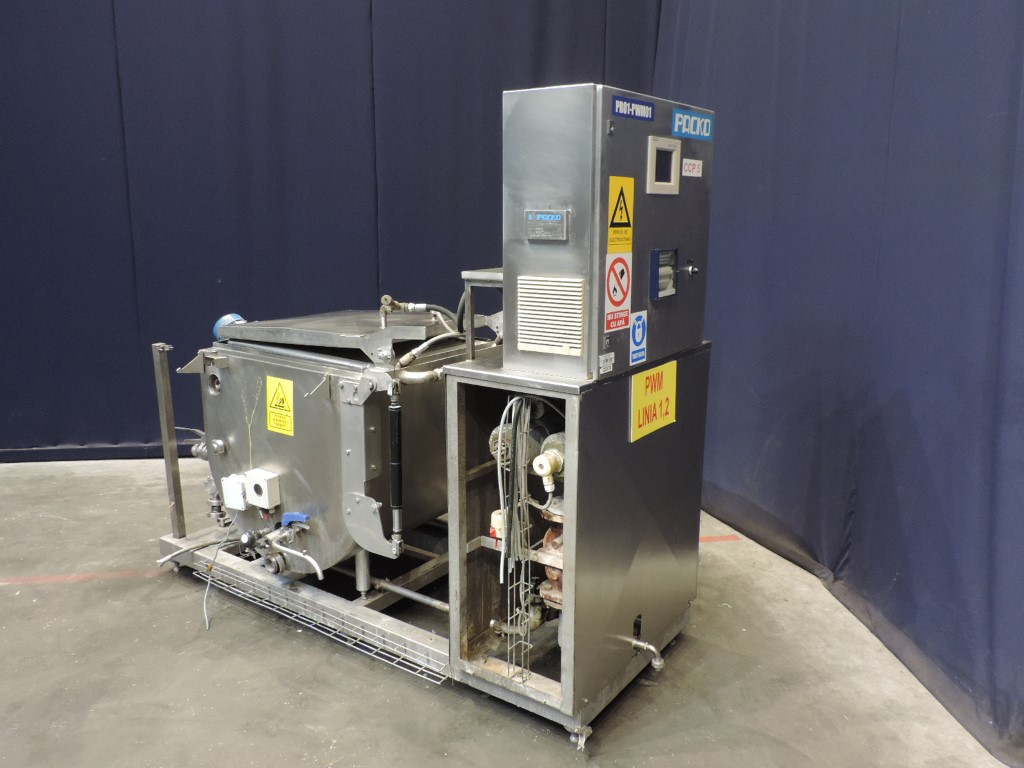 Skidmounted butter or blocks of vegetable fat melting unit including tank (double jacketed) with heated grid and top plate. The blocks are placed on the heated grid and melted. The liquid drops on a plate and afterwards in the collecting tank. The tank has a propellor agitator (motor 0,55 kW) in liquid fat (so also for vegetable fat suitable), cover, LLS and Temperature Transmitter. Electric heating system and hot water circulation pump, Control panel with Siemens S7-200 PLC, Siemens Simatic Touch screen opertor panel and Jumo registration unit. Project number: 02/01855. Total dimensions: 220 x 110 x 190 cm.