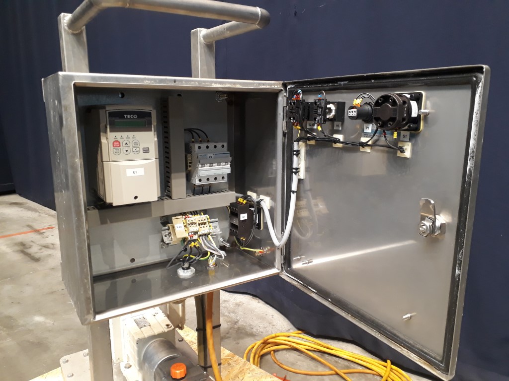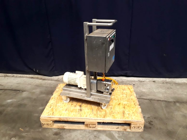 Lobbe pump with duo stainless steel lobbes. Diameter lobbes: 68 mm. Pressure up to 3 bar. Current motor: 0,75 kW - 1,9 A - n1: 1410 rpm, i=5,187, n2: 271 rpm. Displacement 6 ltr/100rev. Mobile. Connections: 1'' / 1''. Including control panel with frequency converter for variabel speed and electric scheme.