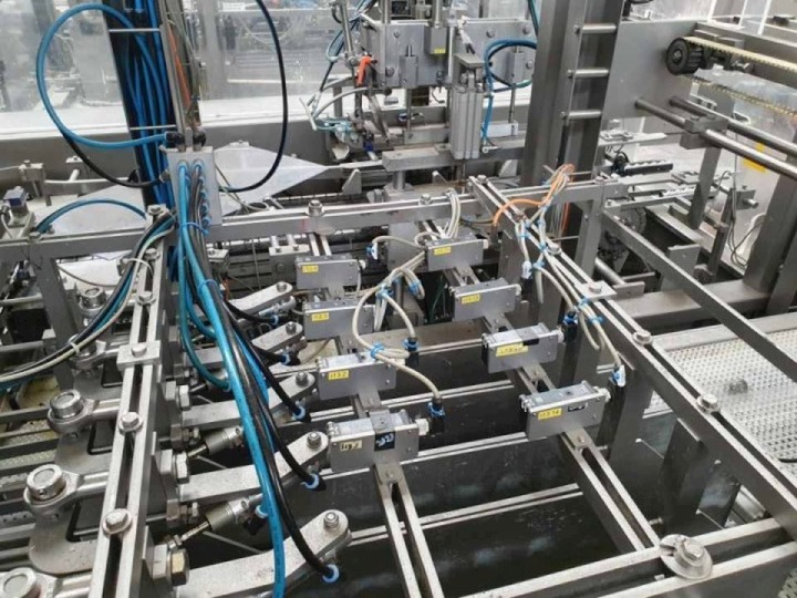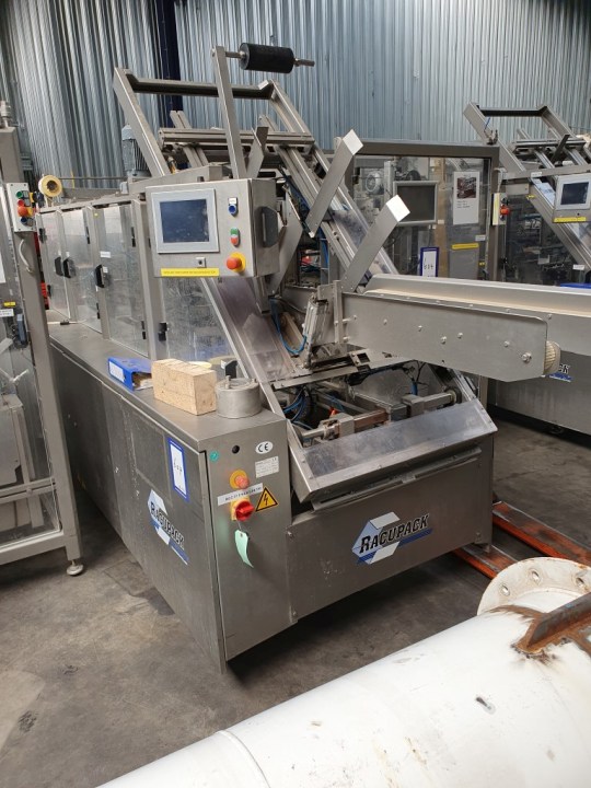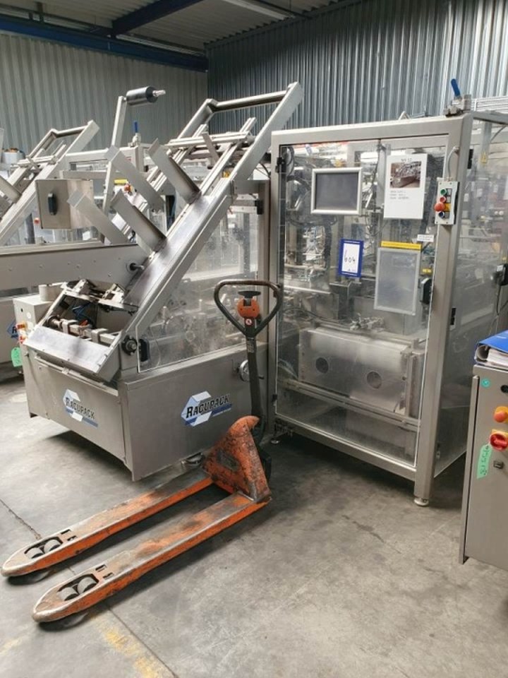 Fully automatic warp-around case packer, flexible format can be used to pack Gable top cartons, bottles, etc in a wrap around plano carton. This machine is flexilbel in formats and was used for gable top cartons: 12x1 liter - package dimensions 72x72x235 mm - packing scheme 4x3x1 (297x225x240 mm each carton). 6x1 liter - package dimensions 72x72x235 mm - package scheme 2x3x1 (155x225x240 mm each carton). 6x0,5 liter - package dimensions 72x72x142 mm - packing scheme 2x3x1 (155x225x240 mm). Infeed system, flexible on formats. Plastic mesh belt, belt width: 620 mm, chain conveyor with /splitter to form the packs before it enters the machine. Belt width: 300 mm, distance between dividers: 180 mm and 230 mm, Outfeed roller conveyor with over push system, roller width: 350-400 mm. Power: 400 V, 3 Ph, 50 Hz, 20 A. Total dimensions: 560x300x260 (lxwxh) cm. Weight: 1.750 kg. With storage bin for glue granulate. Excluded: hotmelt glue unit itself.