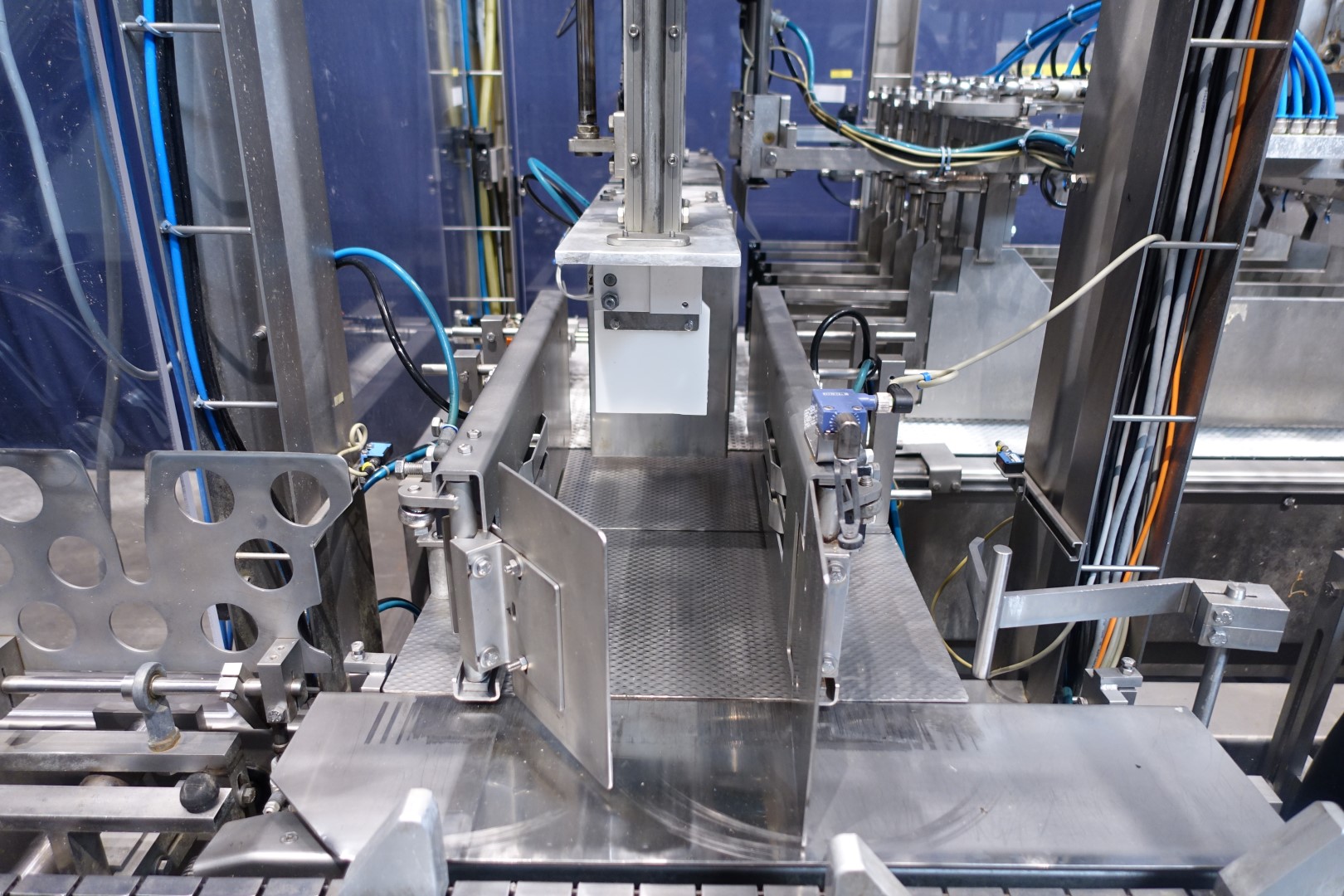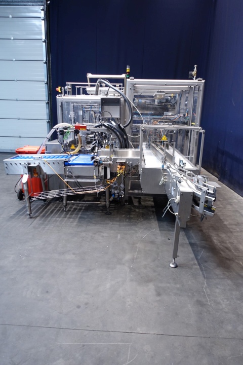 Fully automatic warp-around case packer, flexible format. Can be used to pack gable top cartons, bottles etc. in a wrap around plano carton. This machine is flexilbel in formats and was used for gable top cartons 12x1 liter (70x70 each carton; max capacity 20 boxes per min), 6x1 liter (70x70 each carton; max capacity 24 boxes per min) and box with 6 x 500 ml (70x70 each carton). Infeed system, flexible on formats. Plastic mesh belt, belt width: 620 mm, chain conveyor with /splitter to form the packs before it enters the machine. Belt width: 300 mm, distance between dividers: 180 mm and 230 mm, outfeed roller conveyor with over push system, roller width: 350-400 mm.400 V, 3 Ph, 50 Hz, 20 A. Total dimensions: 560x300x260 (lxwxh) cm. Weight: 2,000 kg. storage bin for glue granulate. Excluded: hotmelt glue unit itself. Documentation: Operational manual and electrical/pneumatic diagrams.