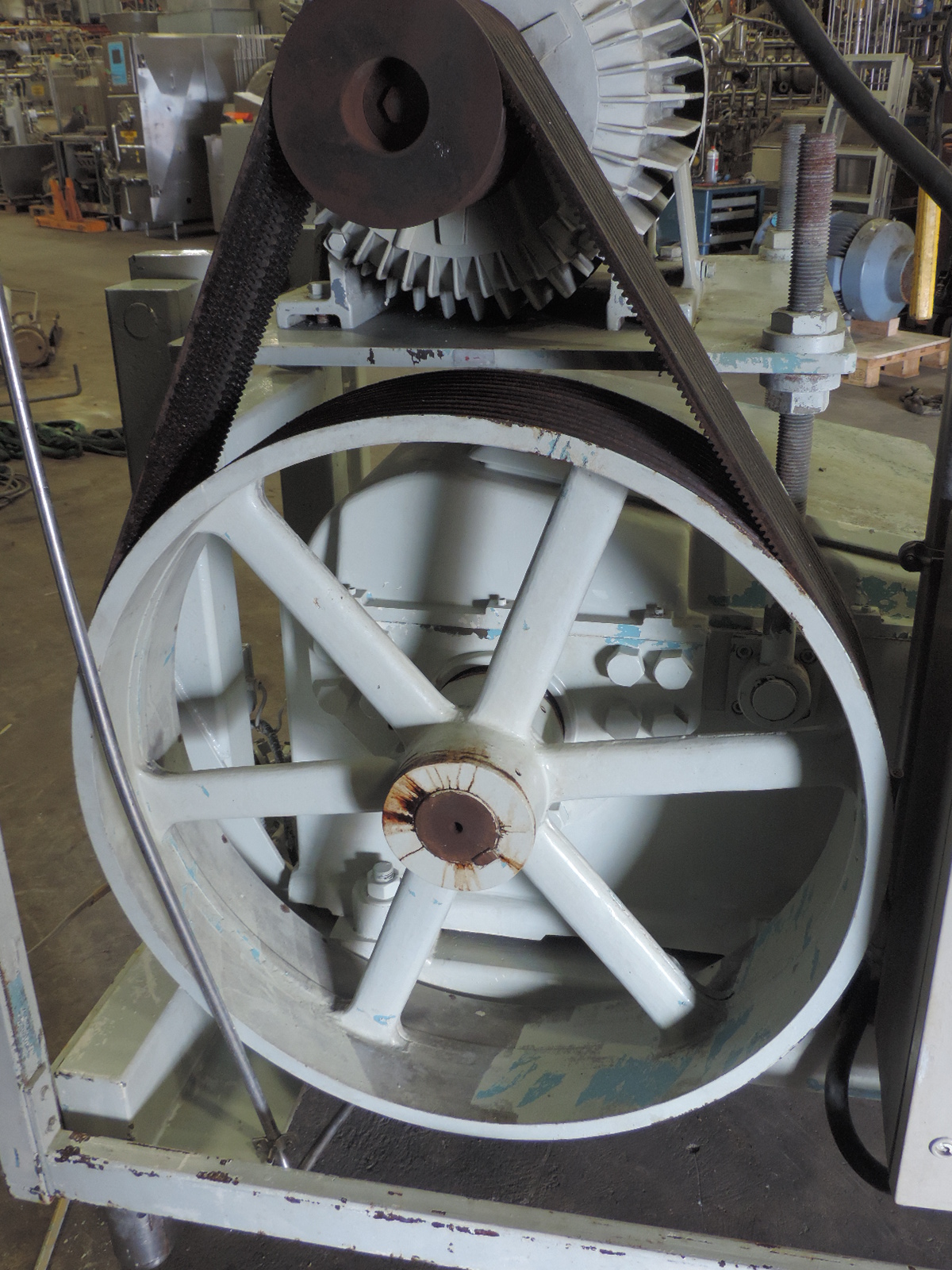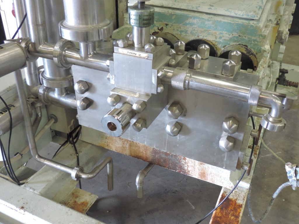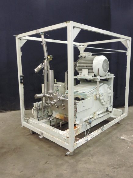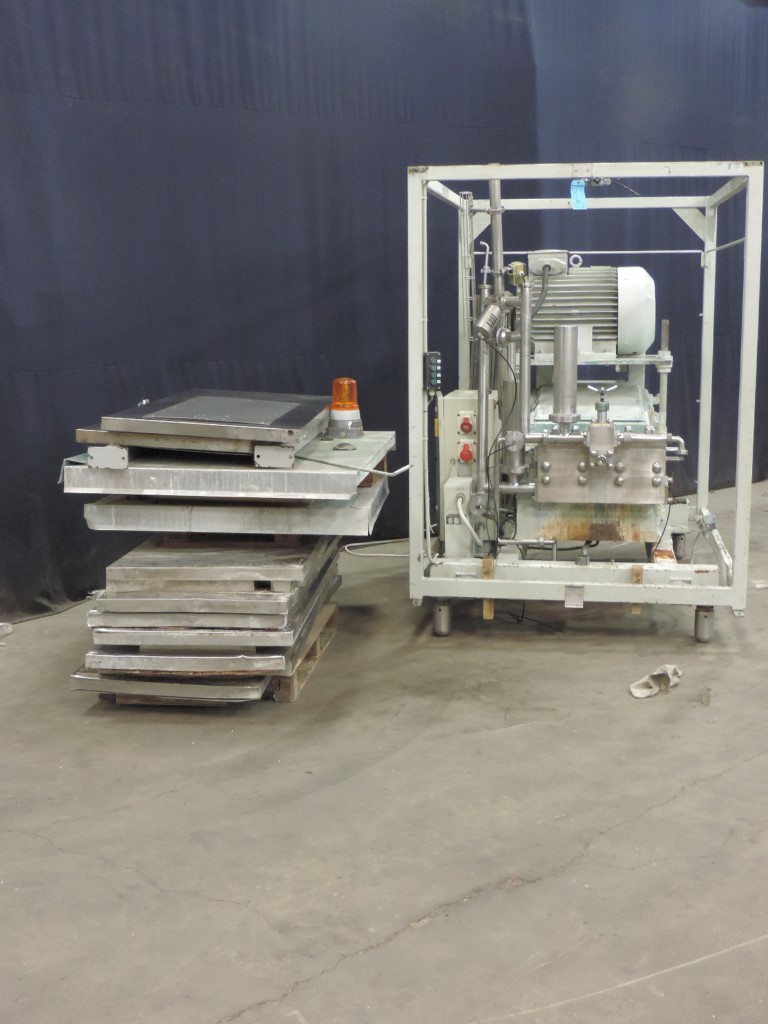 2 stage, manual pressure control, 3 pistons, Piston diameter: 50mm, stroke: 79mm, Stainless steel cladded in sound proof box <80dB, Connections: 2" Din, current motor power: 37KW and maximum pressure in current confirguration with this motor 210bar. Overpressure valve, bypass valve with non return valve, bypass valve with pneumatic butterfly valve, pulsation demper on inlet/outlet. (Cladding incomplete, no control panel). Optional on request: - Freestanding control panel (with relay, or frequentzy converter), - Manometer on inlet - Manometer on in/out outlet - Flowswitch on cooling water - Installation and start-up - Change capacity in liter per hour, maximum change pressure. - Set spares.