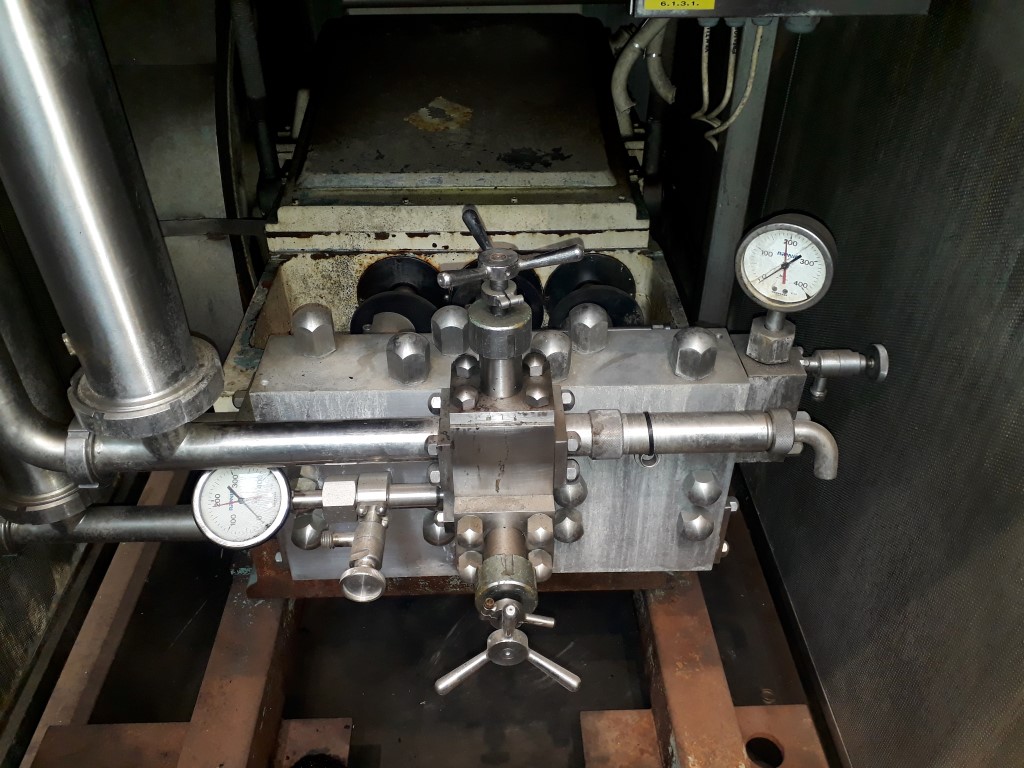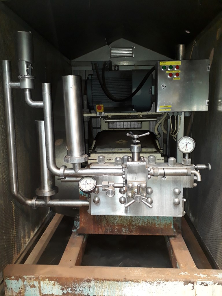 1 stage - 3 pistons,. Capacity: 6875 ltr/h. Pressure: current 125 bar (can be additional adapted by Lekkerkerker to 200 bar). Motor: 3x380 V - 50 Hz - 30 kW - 1460 rpm. Stainless steel sound cabinet.