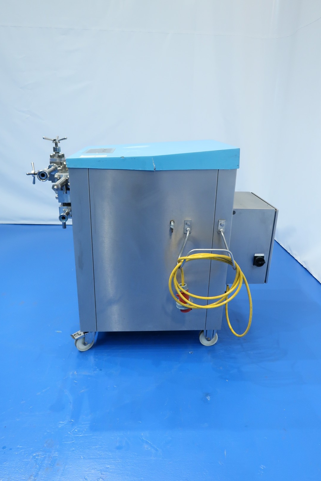 Mobile laboratorium homogenizer. With manual pressure control 1st and 2nd stage and pressure gauges. Piston diameter 12 mm - stroke 51 mm. Motor: 7,5 kW - 15,3 A. Maximum pressure : 1.000 bar. Overpressure valve. Control panel on rearside of machine with frequency converter for variable speed. Total dimensions: 160x100x134 (lxwxh) cm - weight: 520 kg.