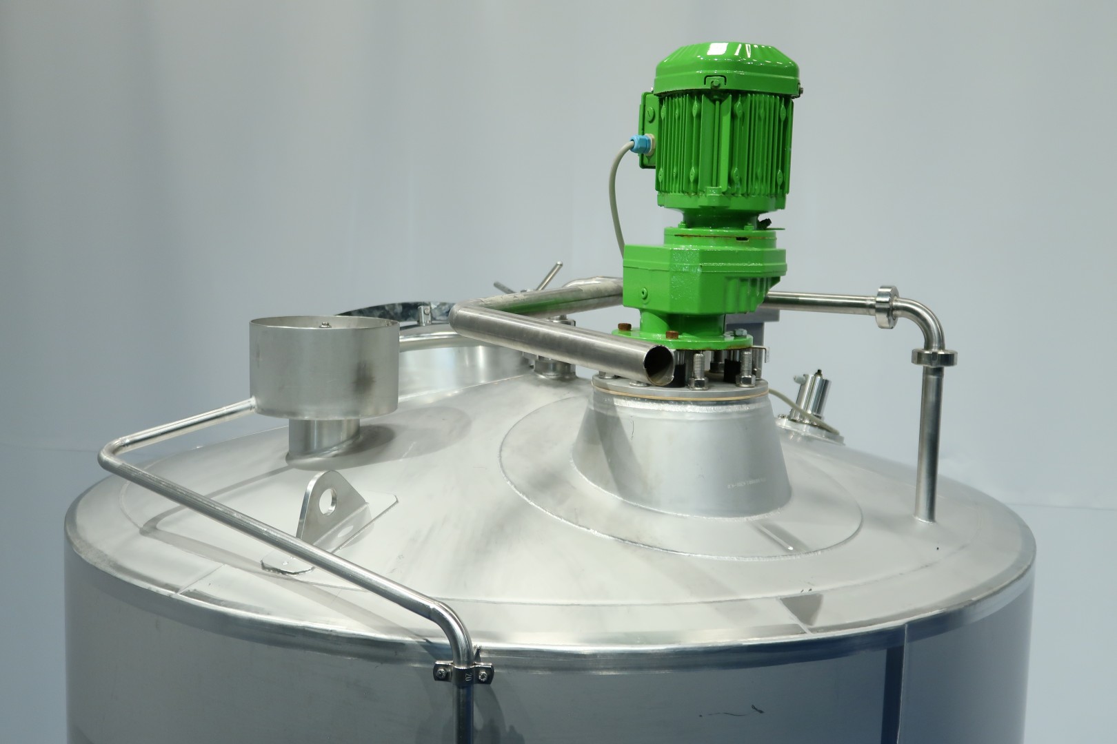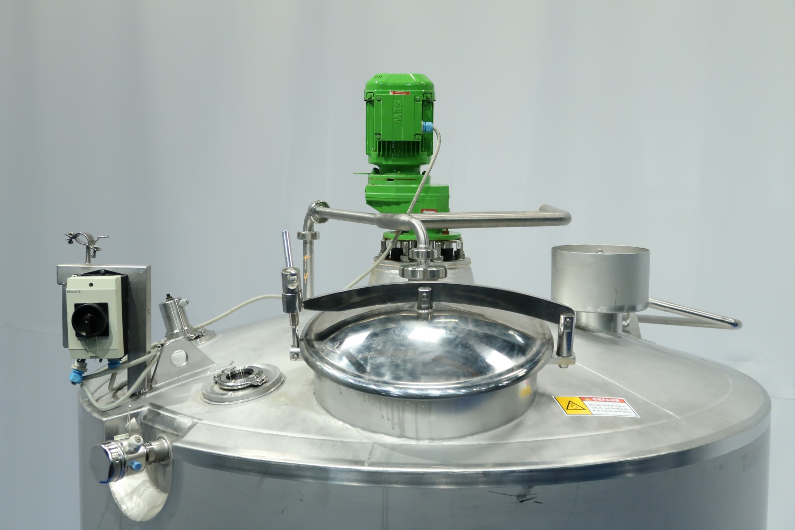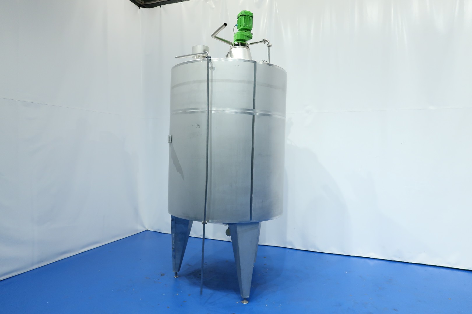 Insulated tank. 2 x Cip spray bowl (1 high and 1 low). With propellor agitator, motor 1,1 kW - 2,45 A - 313 rpm - 50 Hz. Max temperature: 85°C. With level sensor, high and low. With pressure sensor and connection for temperature sensor (currently not included) in bottom. On top: breather, lamp and sight glass. Manhole in top round diameter 42 cm. 3 Adjustable feet, cylindrical height: 183 cm. Outlet connection: 1,5" Din. Total dimensions: 170x160x350 (lxwxh) cm - weight: 630 kg.
