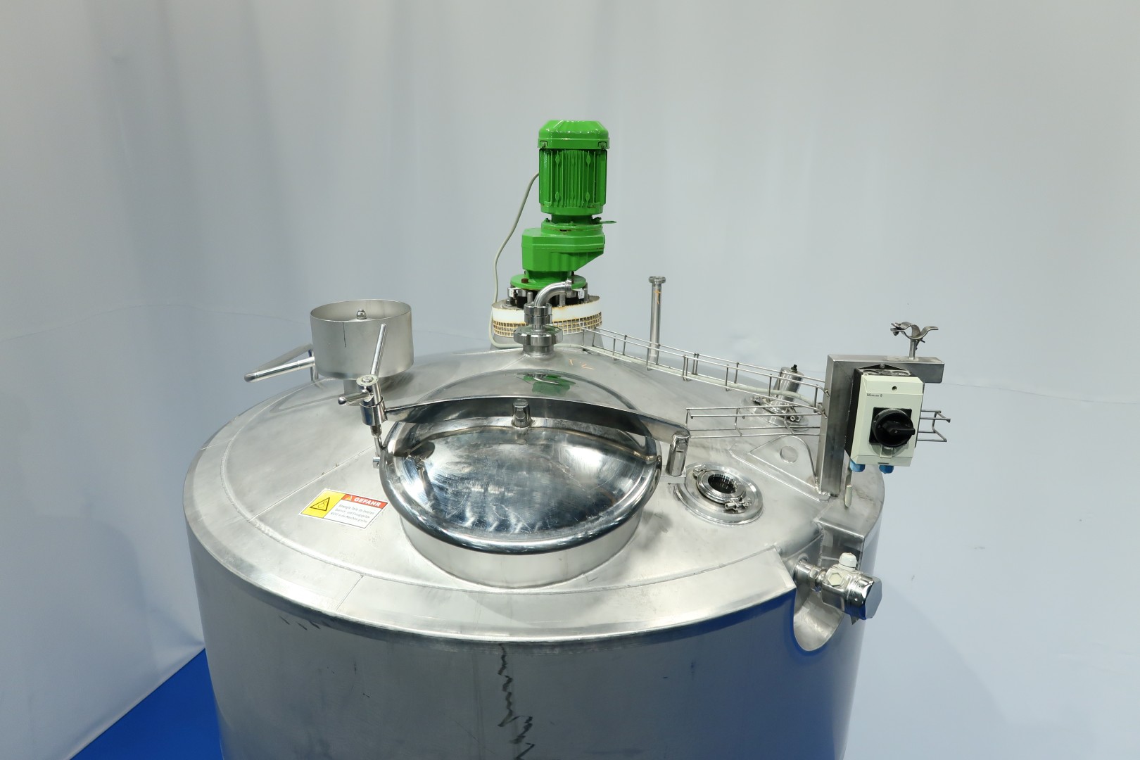 Insulated tank. 2 x Cip spray bowl (1 high and 1 low). With propellor agitator, motor 1,1 kW - 2,45 A -313 rpm - 50 Hz. Max temperature: 85 °C. With level sensor, high and low. With pressure transmitter and temperature transmitter in bottom. On top breather, lamp. Manhole in top round diameter 42 cm. 3 adjustable feet, cylindrical height: 184 cm. Outlet connection: 1,5" Din. Total dimensions: 170x160x355 (lxwxh) cm - weight: 620 kg.