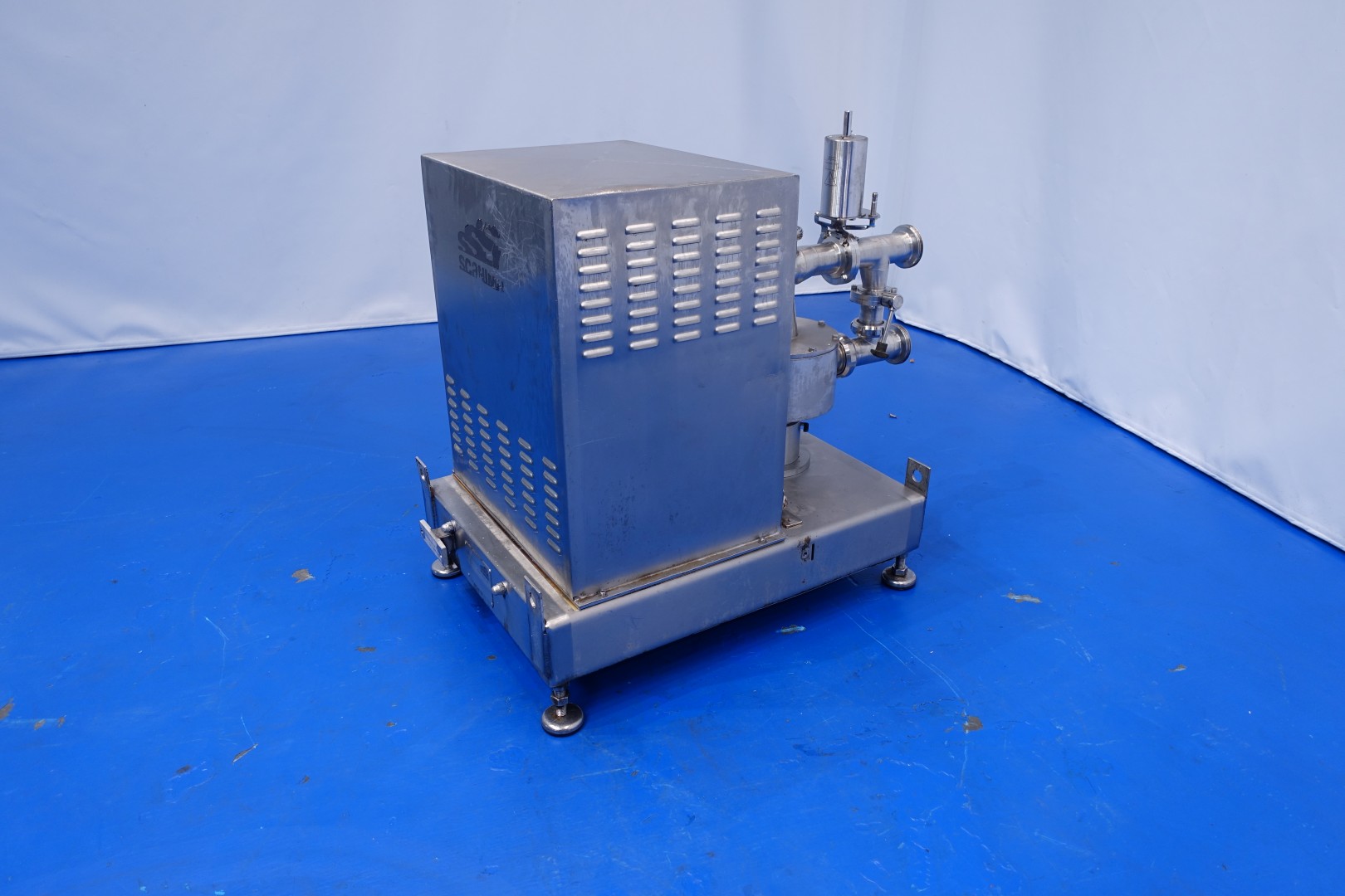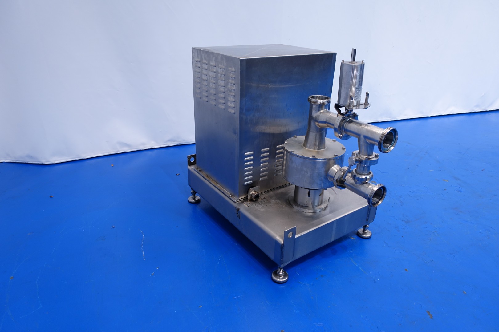 Inline high shear dissolver - dispergator mixer. Impellor diameter: 198 mm. Cilinder diameter: 200 mm, screen hole diameter 4 mm (height cilinder 78 mm). With manual recirculation bypass butterfly valve. Motor: 22,0 kW - 400 V - 38,5 A - 50 Hz - 2.950 rpm. Shaft speed: 2800 rpm. Flushed seal. Connections: 1x 3" SMS and 2x 2,5" Din. Total dimensions: 110x63x90 (lxwxh) cm - weight: 355 kg.