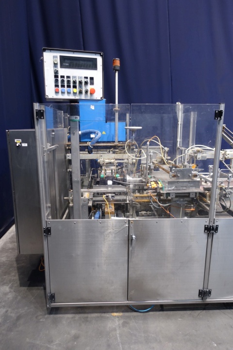 Fully automatic packer, to pack butter packs in an Carton type: American folding box. Operates fully automatically and all principal movements are mechanically driven. Used for 250gr bricks of foil 100 x 75 x 35 mm packed / and wrapped. Layout of the box 4x2x5 layers = 40 packs of 250 gram per carton = 10kg / carton. Nordson Microset Multiscan hotmelt glue unit with 3 hoses and 4 glue points. Controls Siemens S7 PLC. Total machine dimensions: 440 x 185 x 220 cm, weight: 2.051 kg's. Also available in complete line with SIG packer (STN15438), interconnecting conveyors and metal detector (STN15450).