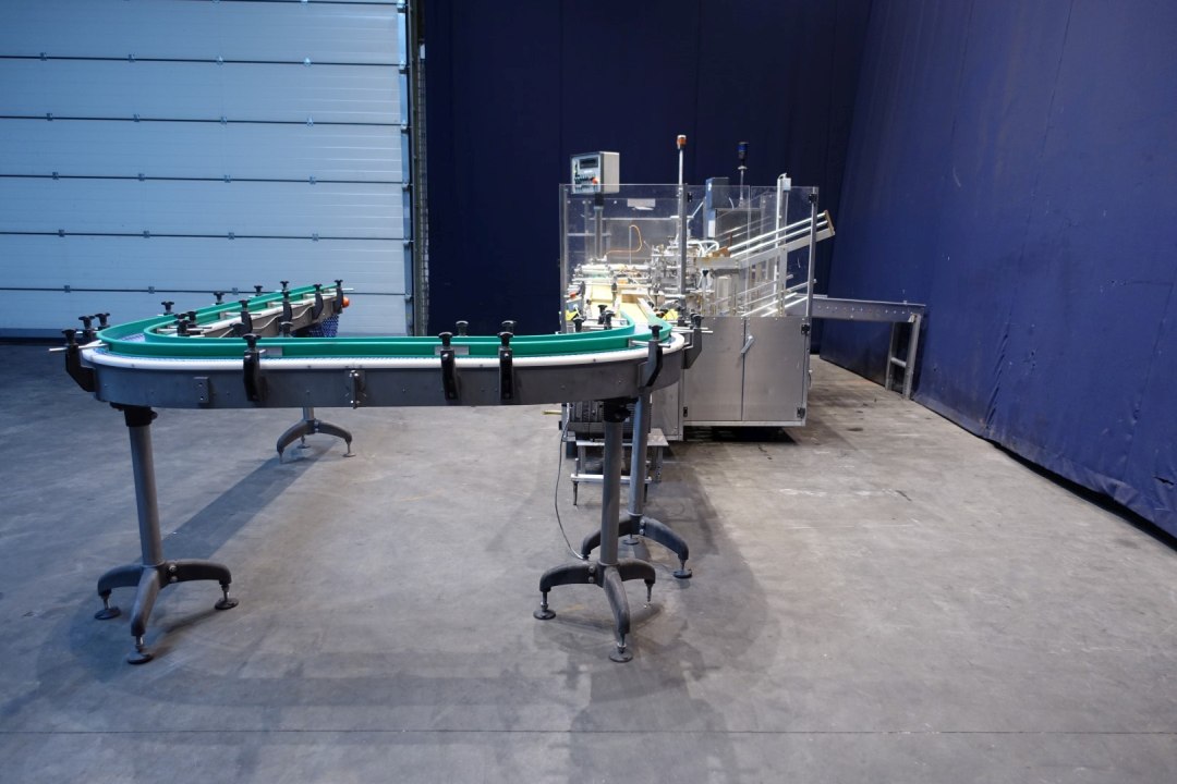 Fully automatic packer, to pack butter packs in an Carton type: American folding box. Operates fully automatically and all principal movements are mechanically driven. Used for 250gr bricks of foil 100 x 75 x 35 mm packed / and wrapped. Layout of the box 4x2x5 layers = 40 packs of 250 gram per carton = 10kg / carton. = max. 240 packages per min on input, 1 or 2 lanes. Nordson Microset Multiscan hotmelt glue unit with 3 hoses and 4 glue points. Controls Siemens Simatic S5. Total machine dimensions: 392 x 178 x 212 cm, weight: 2.090 kg's. Also available in complete line with SIG packer (STN15445), interconnecting conveyors and metal detector (STN15449). Operation manual (folder) including electric diagram available.