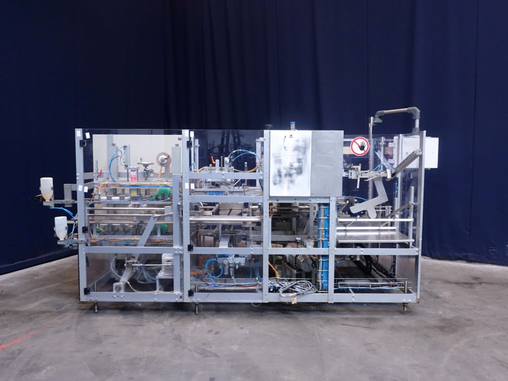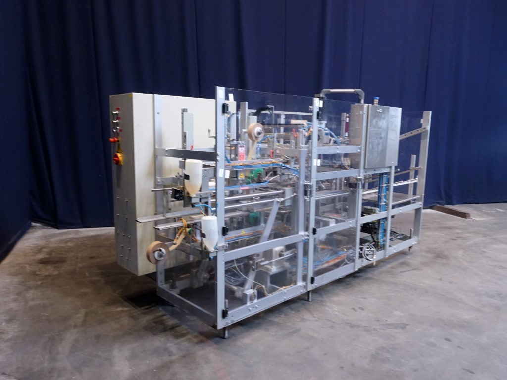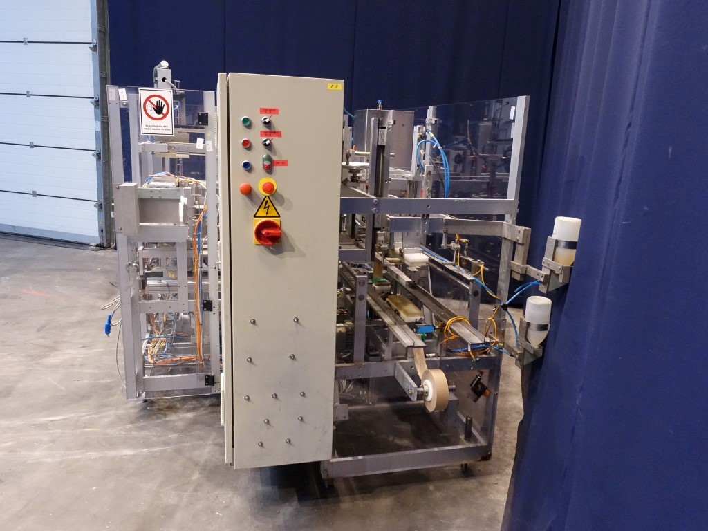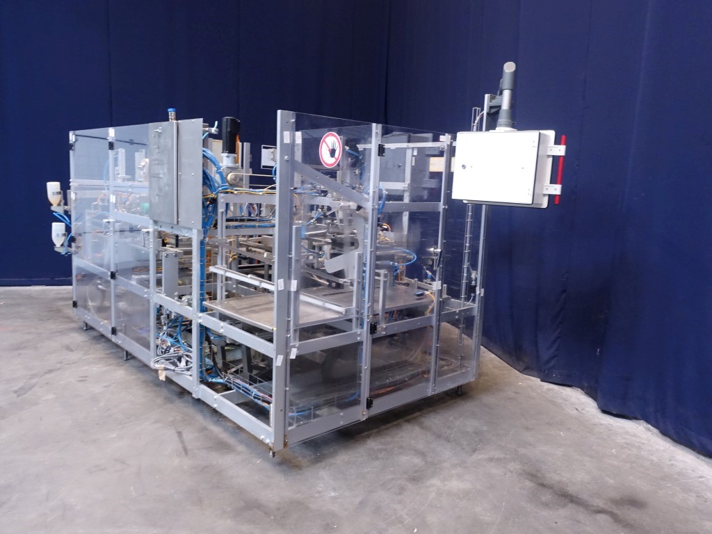 Fully automatic case packer for American folding boxes. Used for 1 kg and 2 kg bricks of foil. Format of bricks: 250 x 95 x 46/92 mm. Layout of the box 3 x 1 x 4 / 2 layers = 12 or 6 packs = 12 kg per box. Siemens controls. 2 Servo motors. Including taper. Total dimensions: 360 x 180 x 210 cm. Has been running together with Benhil 8346 foil packing and wrapping machine for margarine (STN14289).
