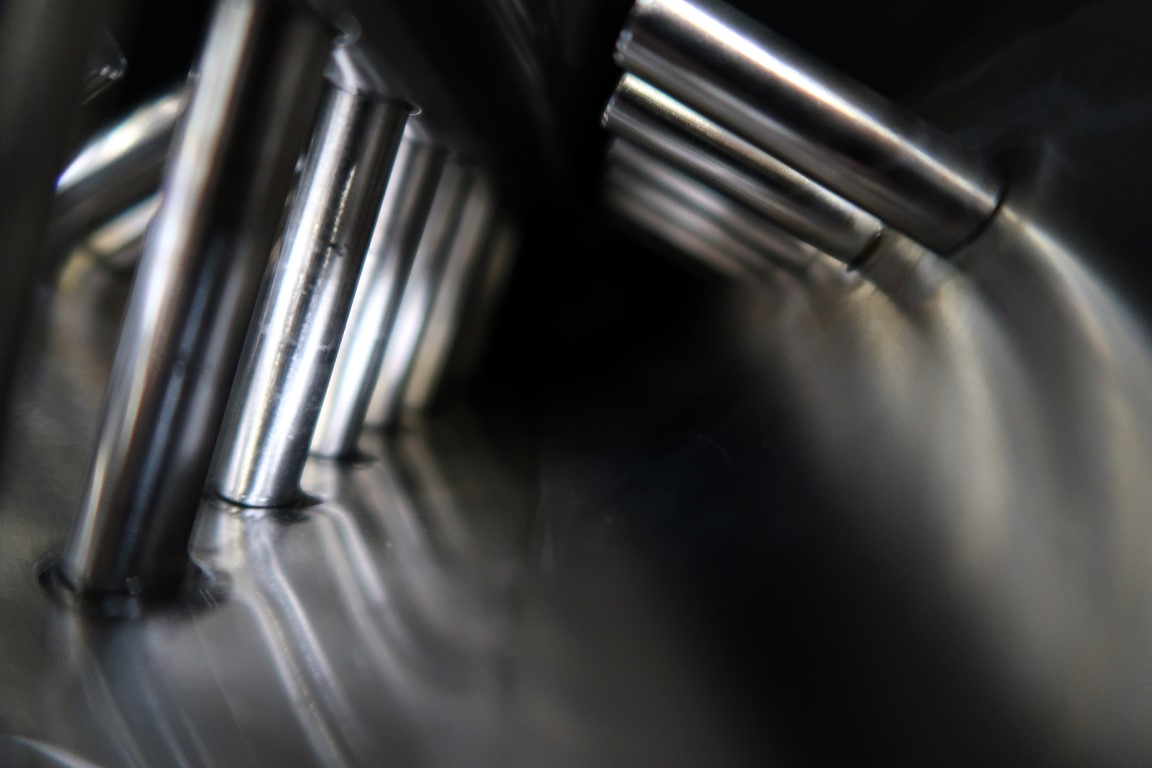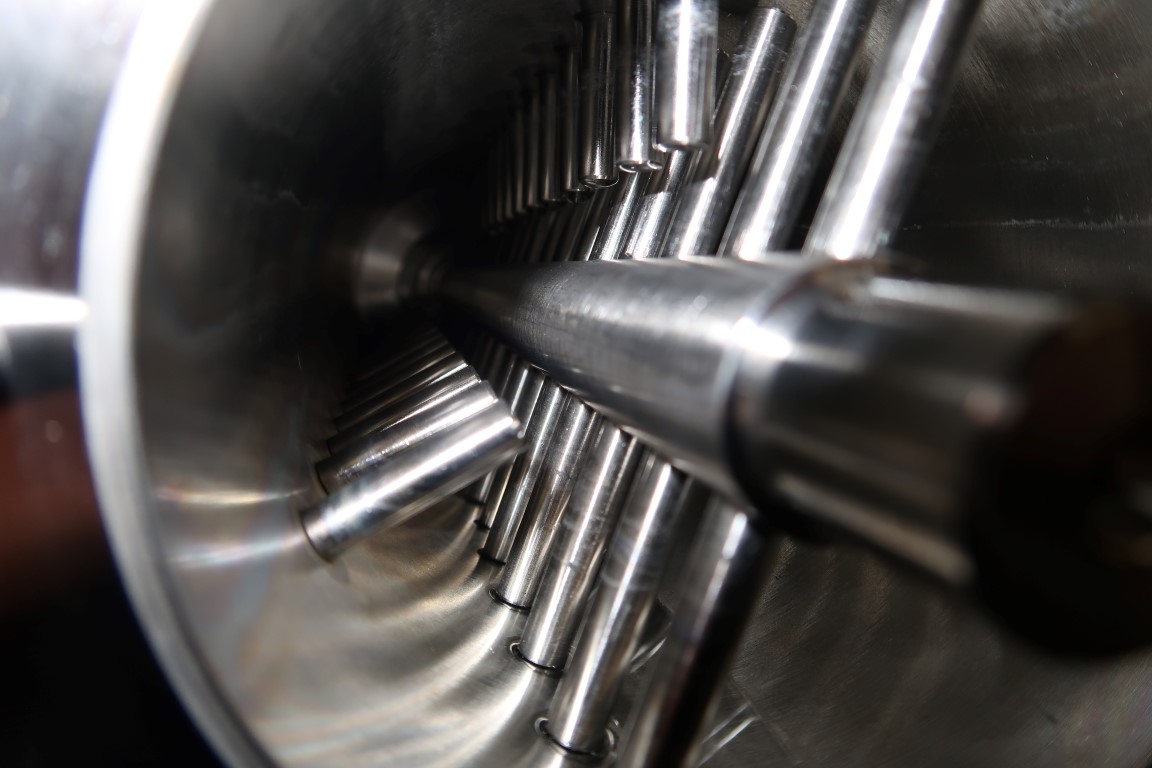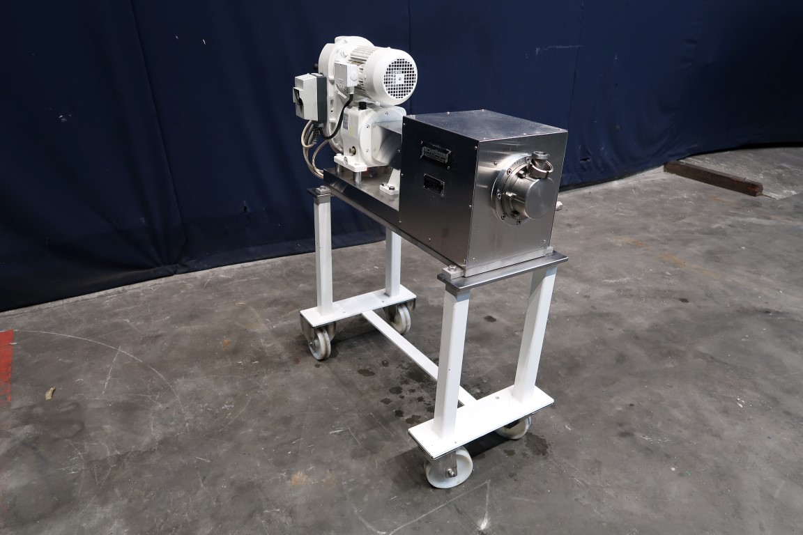 Pinmixer on mobile frame with driverwork with variator and on/off switch. Tube diameter 100 mm, length: 350 mm. 13-13-13 pins on the cylinder. 17 pins on the rotor. N2 16-48 rpm. Total dimensions: 50 x 130 x 130 cm.