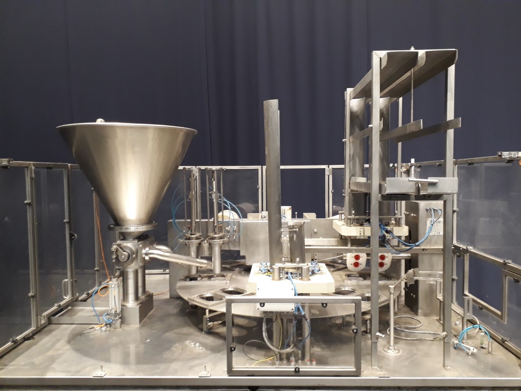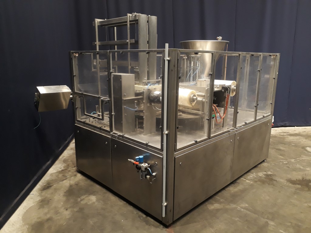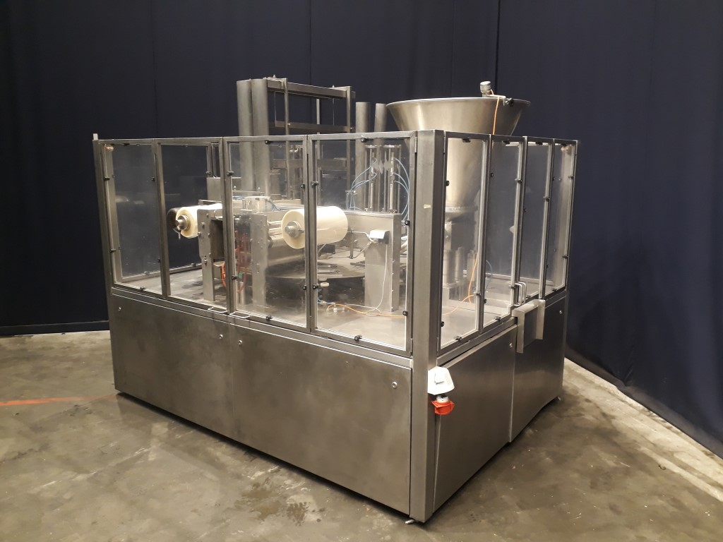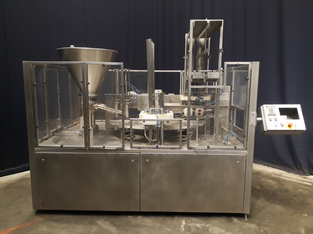 Rotary cup filling and sealing from the reel machine with 2 heads. Stations: Cup destacking, main piston doser (100 - 550 ml) for viscose products (pneumatic) with single jacketed hopper. Sealing from the reel (film width 330 mm, no preformed seals). Heat sealing and snap cap station. No outfeed conveyor. Machine has polycarbonate safety guards. Easy format change. Controls: PLC Siemens S7-300 without operation panel. Electric scheme available.