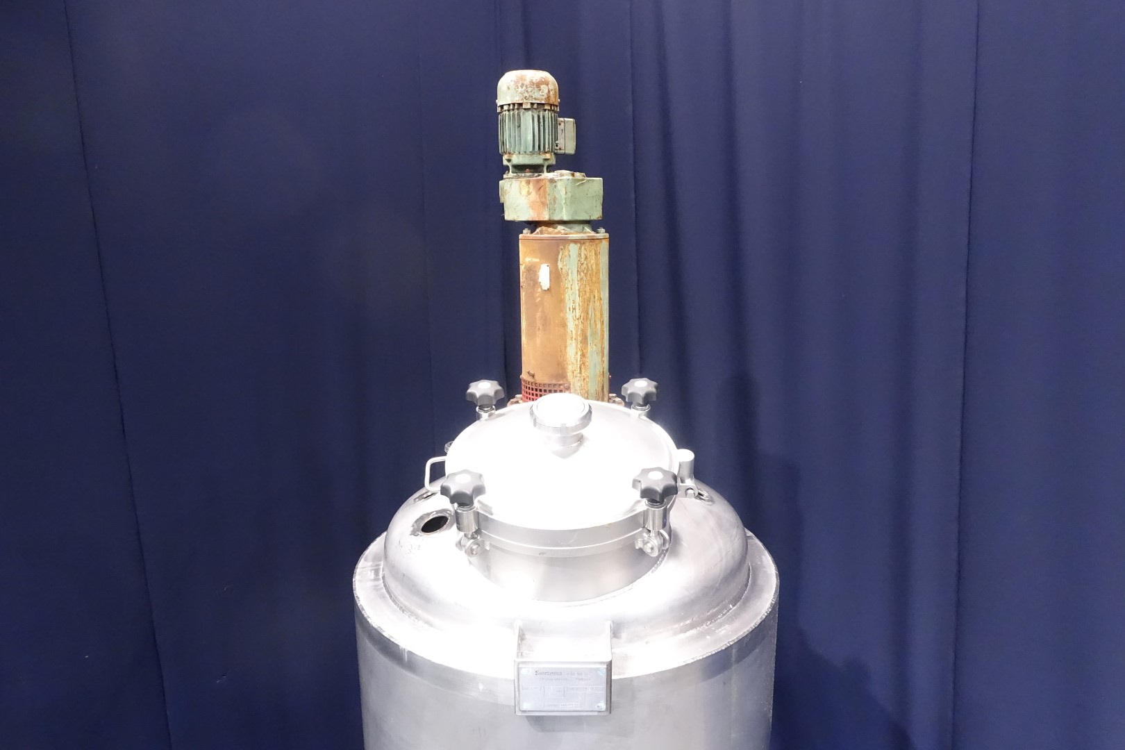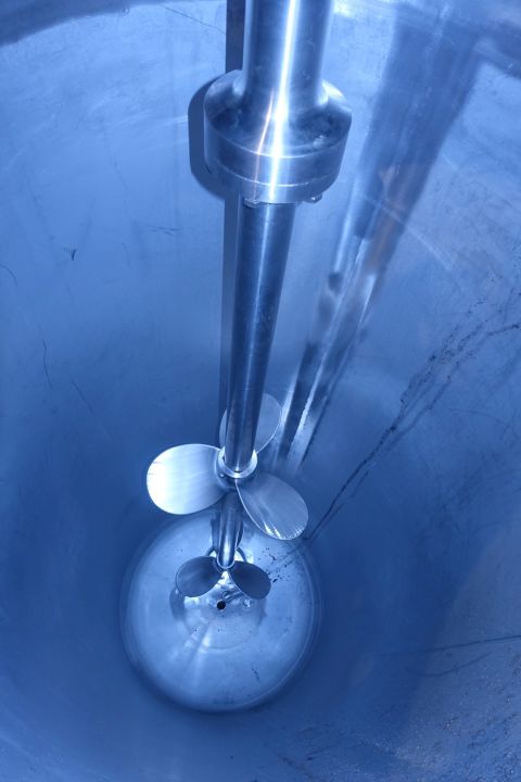 Double jacketed process tank. Top driven double propellor agitator. Motor power: 0,55 kW - n2: 151 rpm. Pressure: 1,5 / 3 bar. Test pressure: 4/-1 bar. Max temperature: 150 °C. Bottom flat, product outlet bottom, 2'' SMS. Sample valve at the side. Connections for: PT-100 tempemperature sensor. CIP cleanable. Manhole in top, round. 3 Adjustable feet. Inside dimensions of tank: Ø 80 cm and height 220 cm. Total dimensions: 80 x 80 x 390 cm.