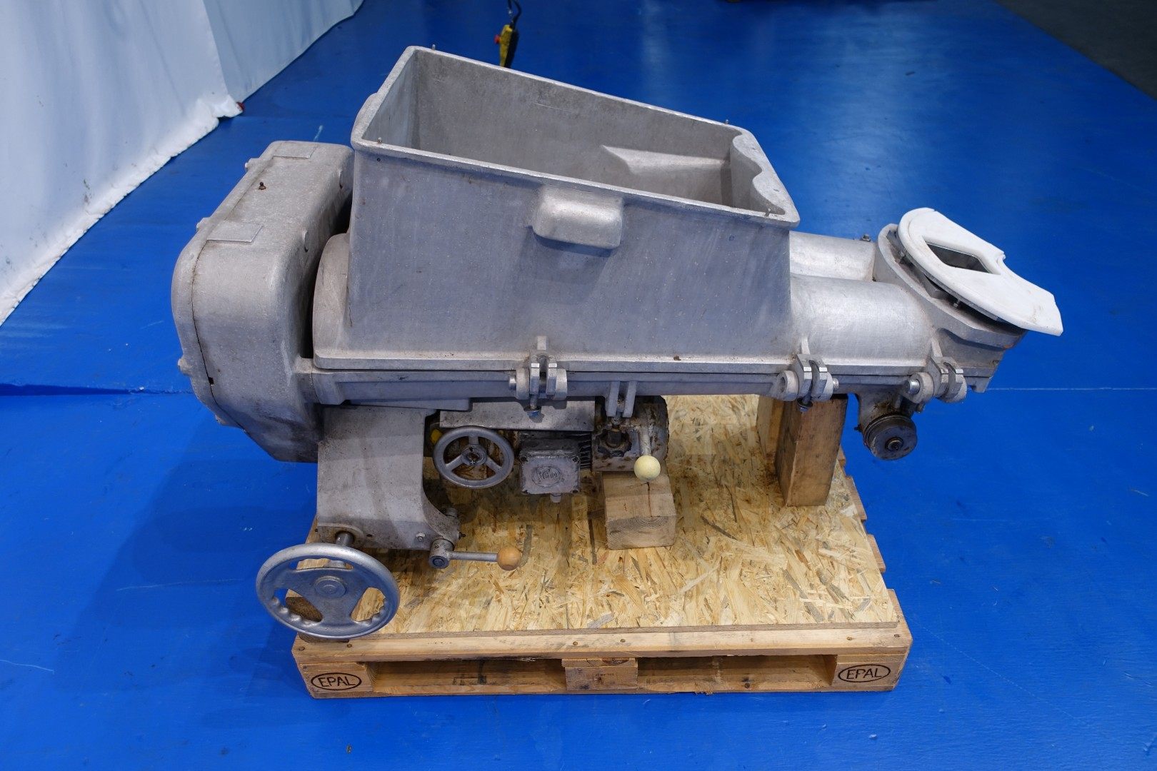 Full Automatic filling and wrapping machine for butter in aluminum foil or parchment paper. Original type FD100, converted to F100. Product feed by trough and augers. No date coder or photo cell. Outfeed conveyor of 150 cm length. Format 106x65x40mm 250gr incomplete. + several format parts (incomplete). Control panel with PLC control (Hitachi EH-150) operator controls by toch screen HMI. With a lot of F(D)100 parts. Total dimensions: 354x135x188 (lxwxh) cm - weight: 2.620 kg.