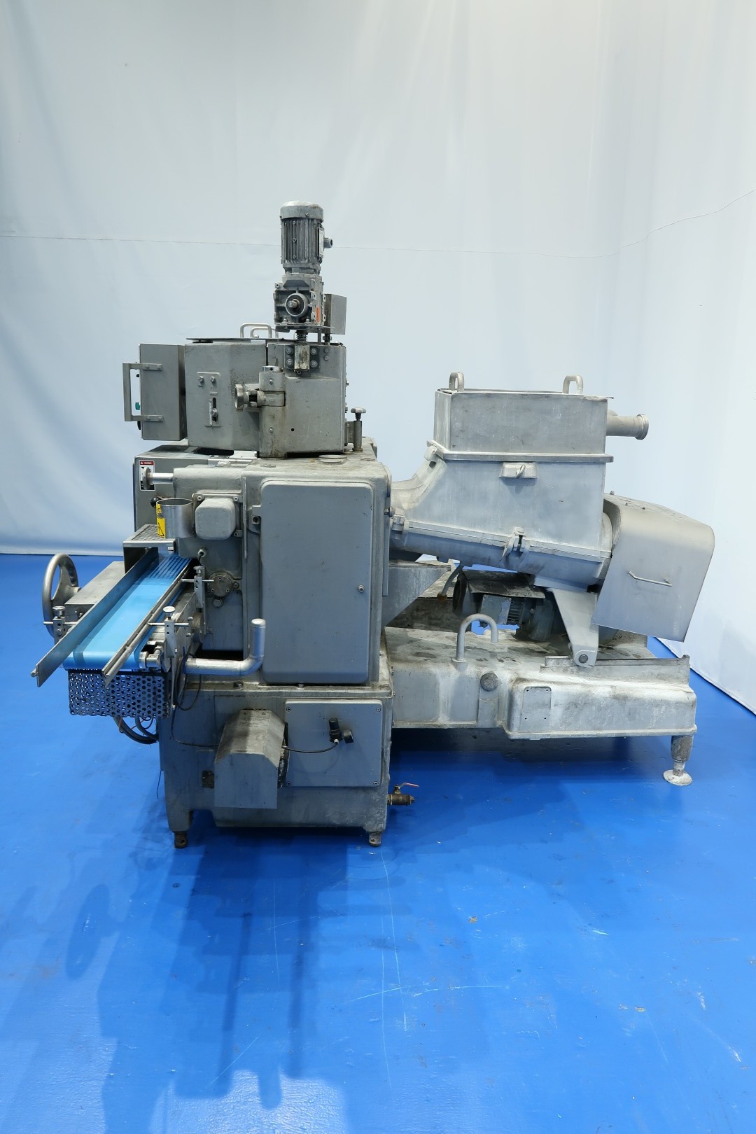 Full Automatic filling and wrapping machine for butter in aluminum foil or parchment paper. Product feed by trough and augers. Outfeed conveyor of 110 cm. 1x French format sets on this machine: 108x63x39 mm = 250 gram. mechanincally prepared for hotmelt. Control panel with PLC control (Modicon TSC Micro). Total dimensions: 314x226x200 (lxwxh) cm - weight ca.: 2.750 kg.