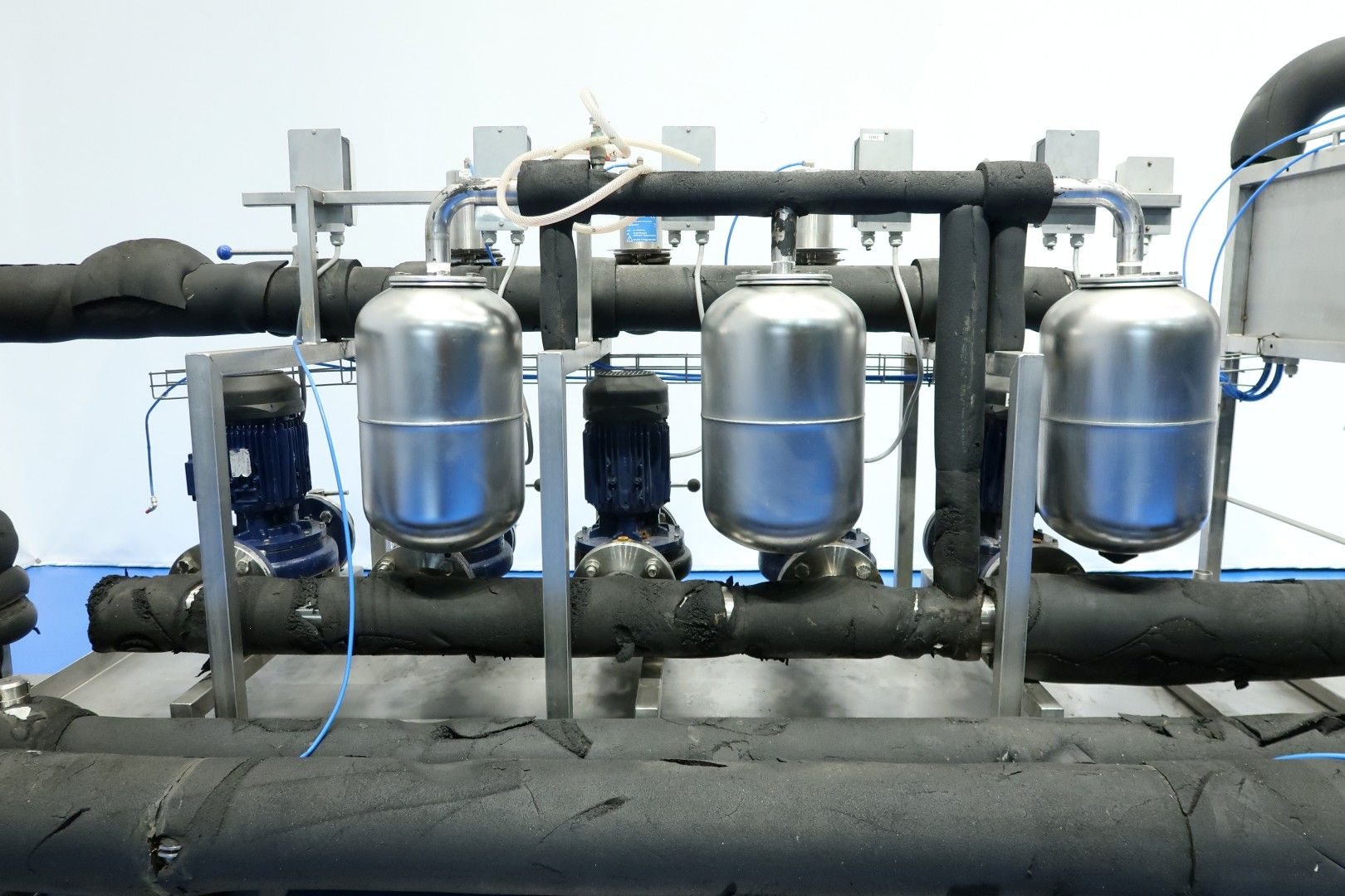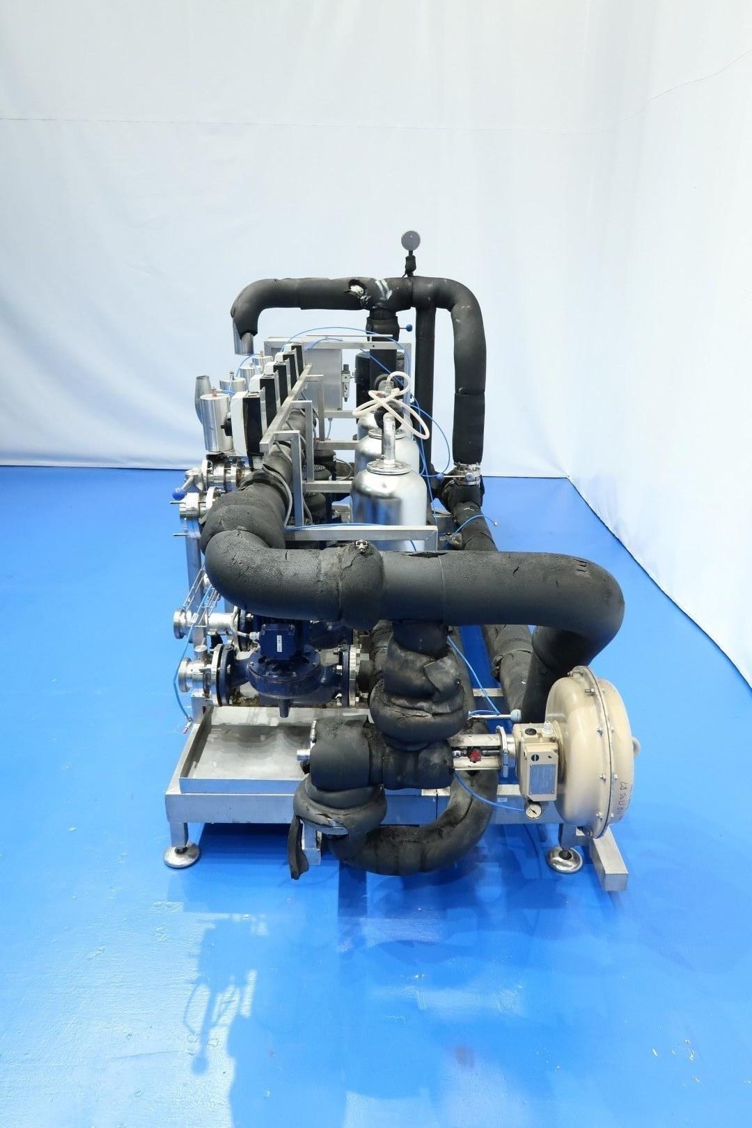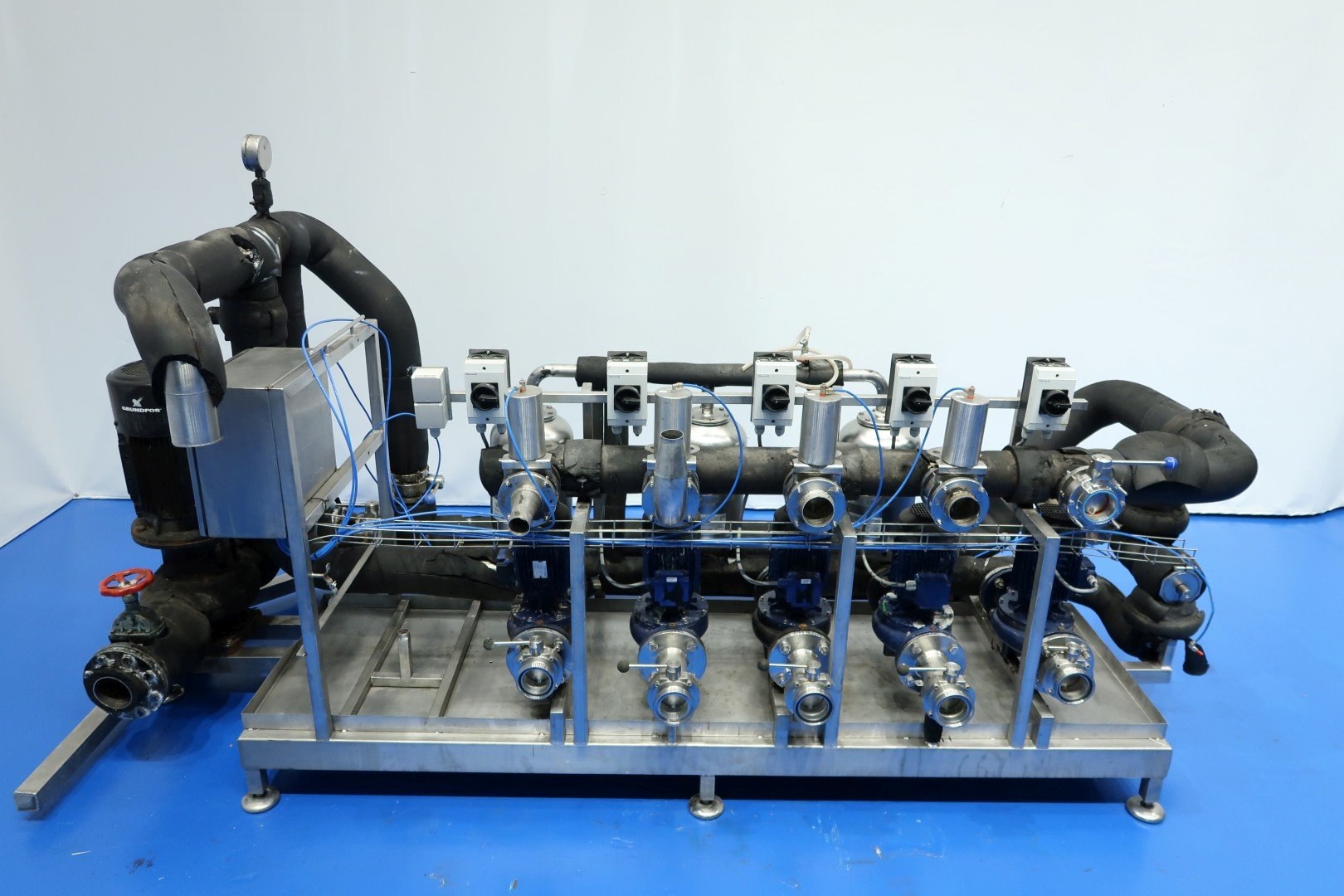Circulation pump set built on SS frame with leakage plate and adjustable feet. Consists out of 5 x Smedegard Omega 6-140-2 non sanitary pumps (3,0 kW - 6,5 A - 2.810 rpm - 50 Hz) and 1 x Grundfoss pump (15 kW - 2.940 rpm). With butterfly valves - Samson valve, Pressure manometer and 3 x SS pressure vessel. Previously used as glycol pump-set. Total dimensions: 348x130x173 (lxwxh) cm - weight: 980 kg.