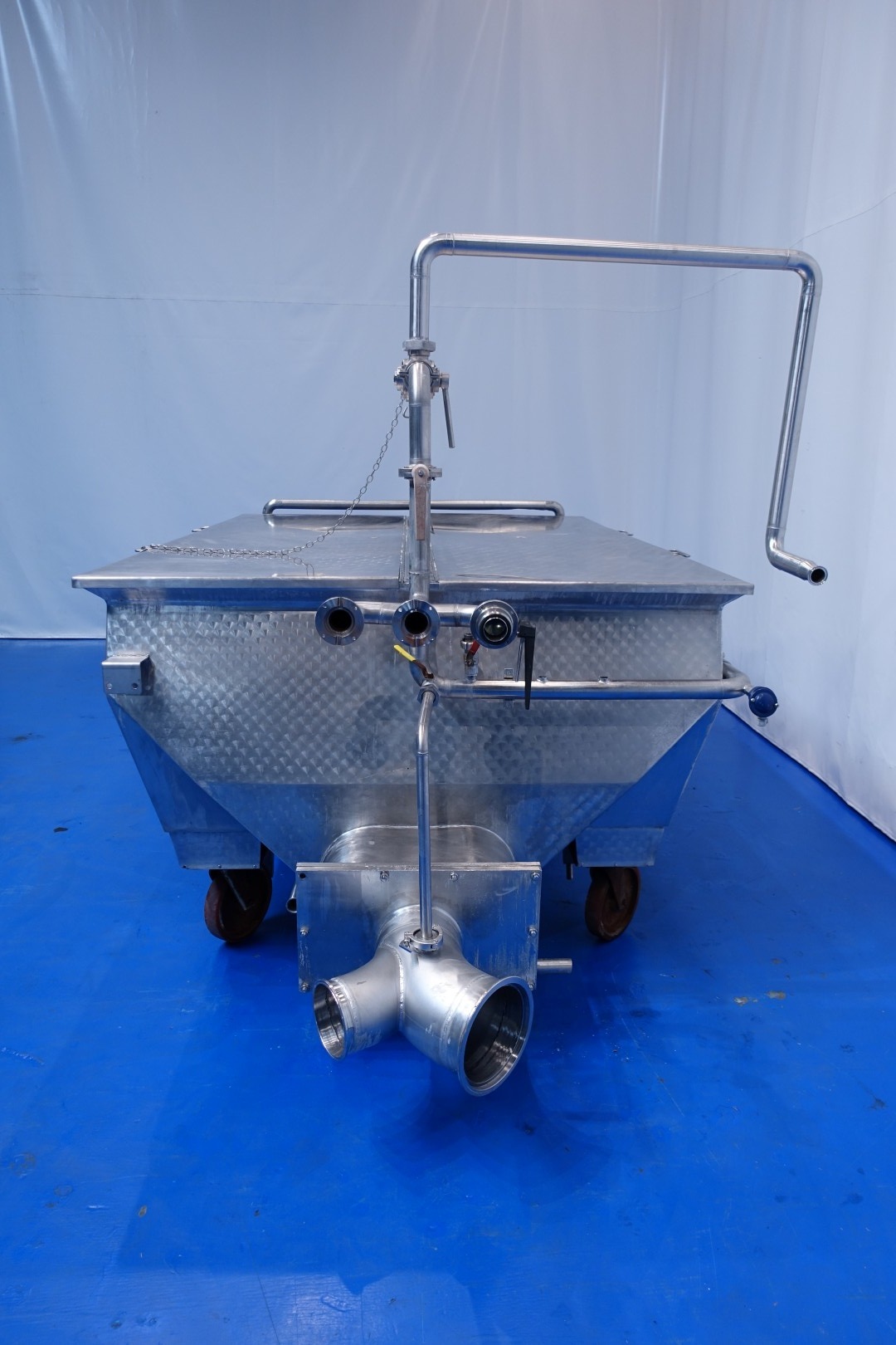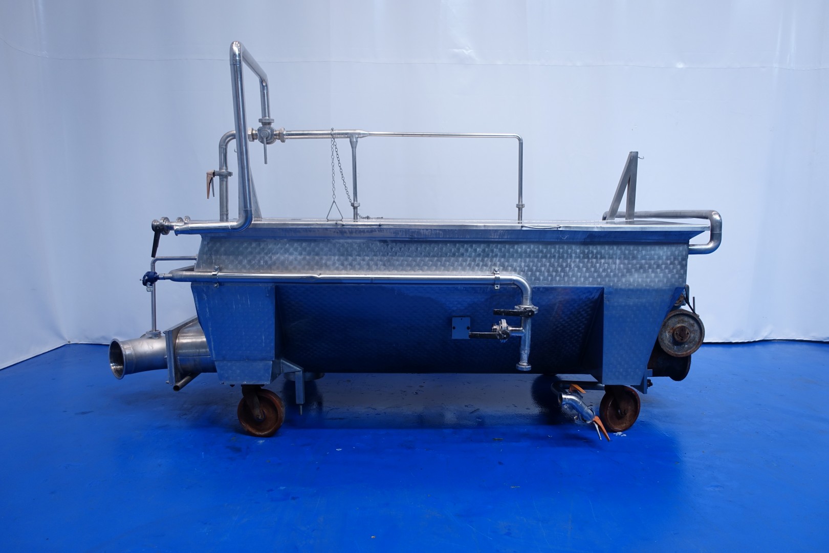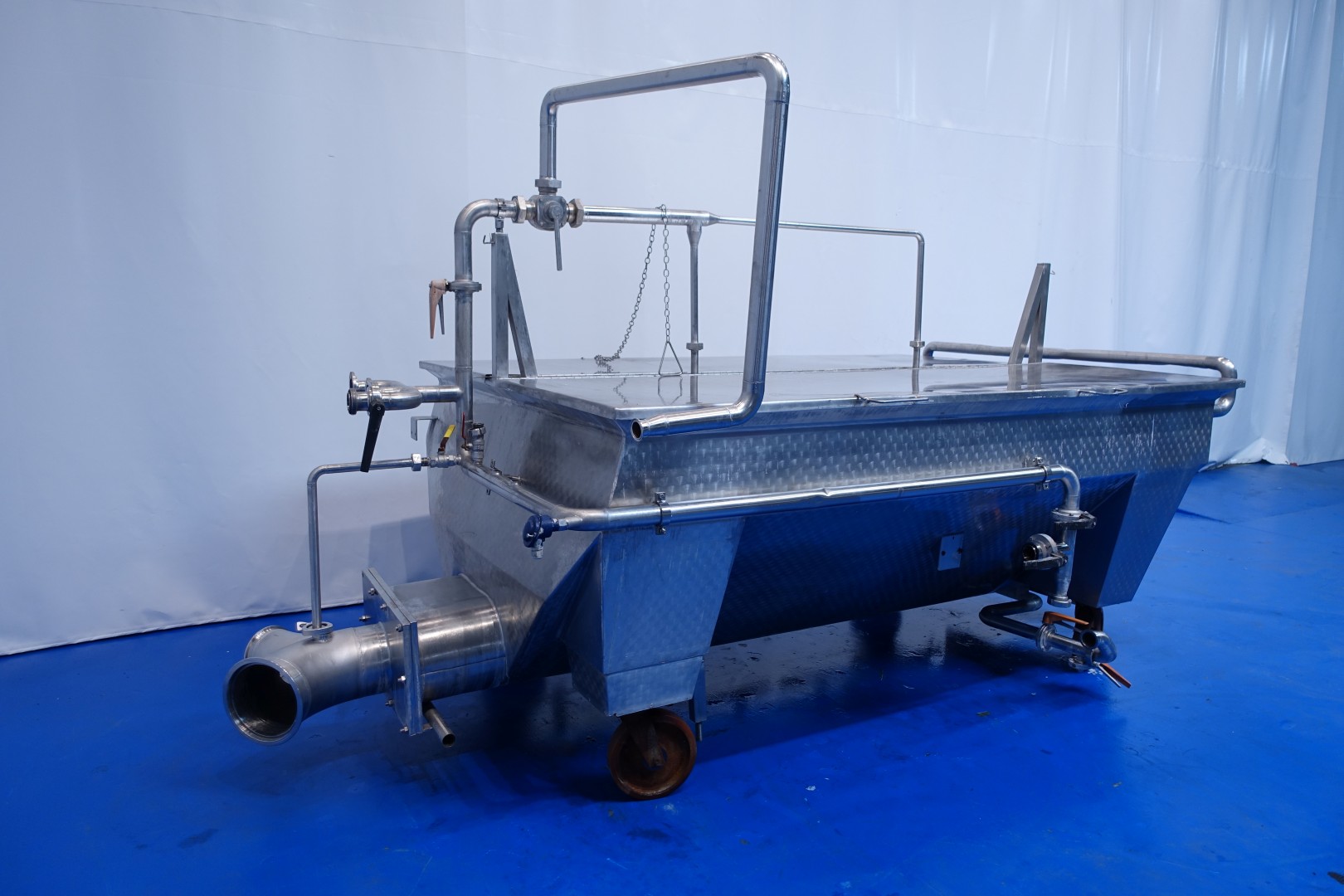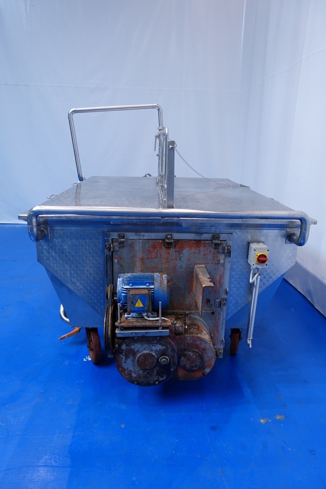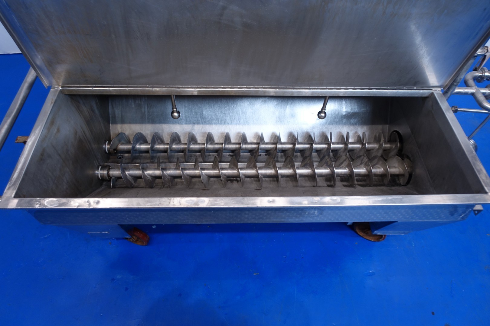 Mobile open butter silo with covers. 2 Augers with 1 motor. Length of the augers 265 cm. Motor power: 2,2 kW - 5,2 A - 950 rpm - 50 Hz. One cover on each side which can be opened. CIP cleanable by 2 spray bowls in tank and 1 at outfeed augers. 2 x round Flange connections for butter pumps 1x Ø 165 mm and 1 x Ø245 mm. Total outside dimensions: 340x184x195 (lxwxh) cm, weight: 1.050 kg.