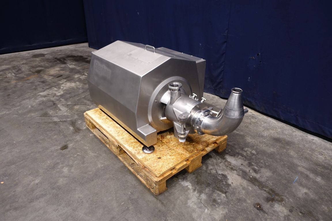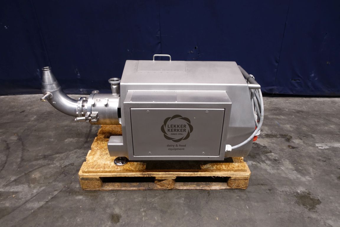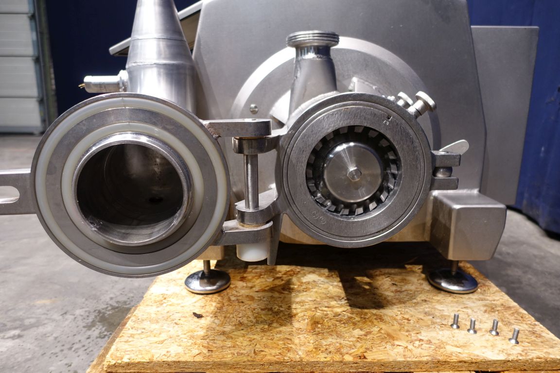 inlijn Emulgator with hopper, 2 stage, with control panel. knives 2x 0.7mm Motor details: power : 30KW, speed 2.950rpm, 59A, 400V, type 200L.20. Emulsifying and pumping function up to 12.000ltr/h at 2bar. already rebuild upgraded seals up to 5bar, inlet 5" pipe with 90° Bend but also hopper infeed available (dismantled).