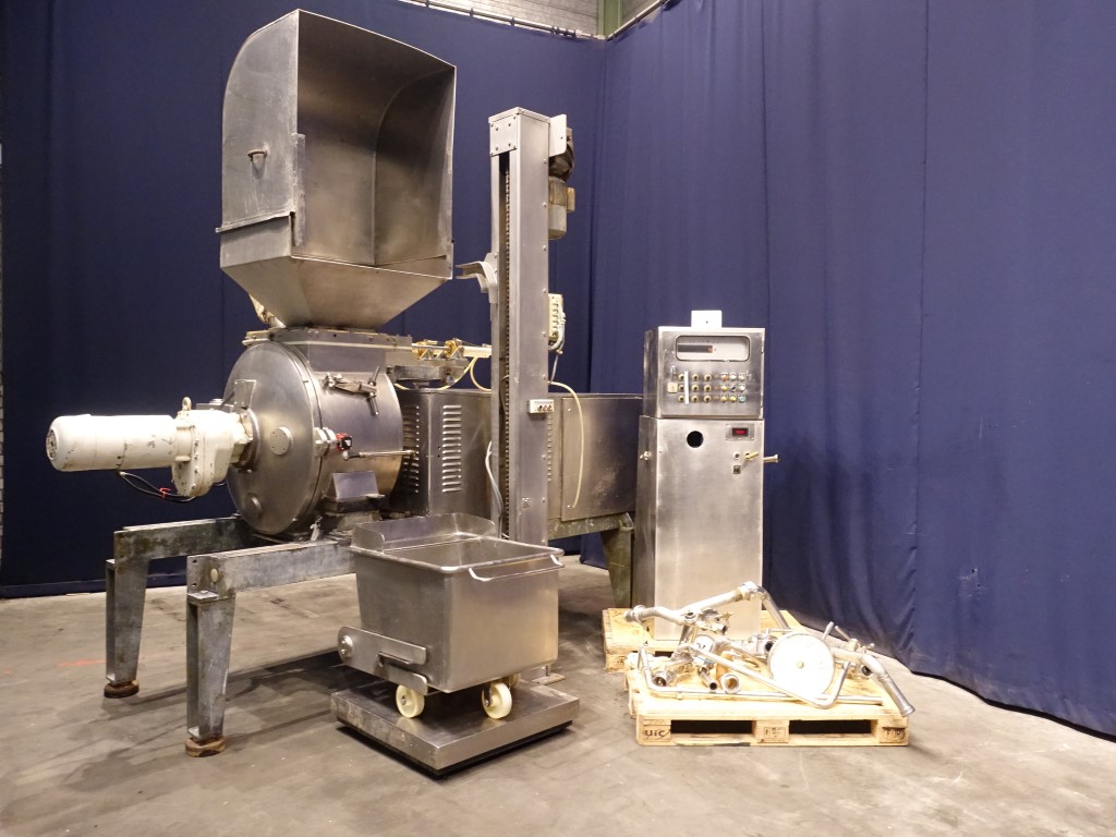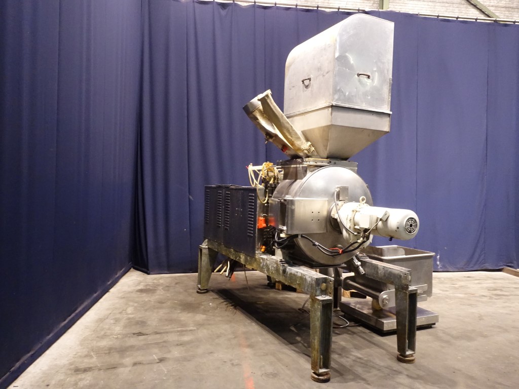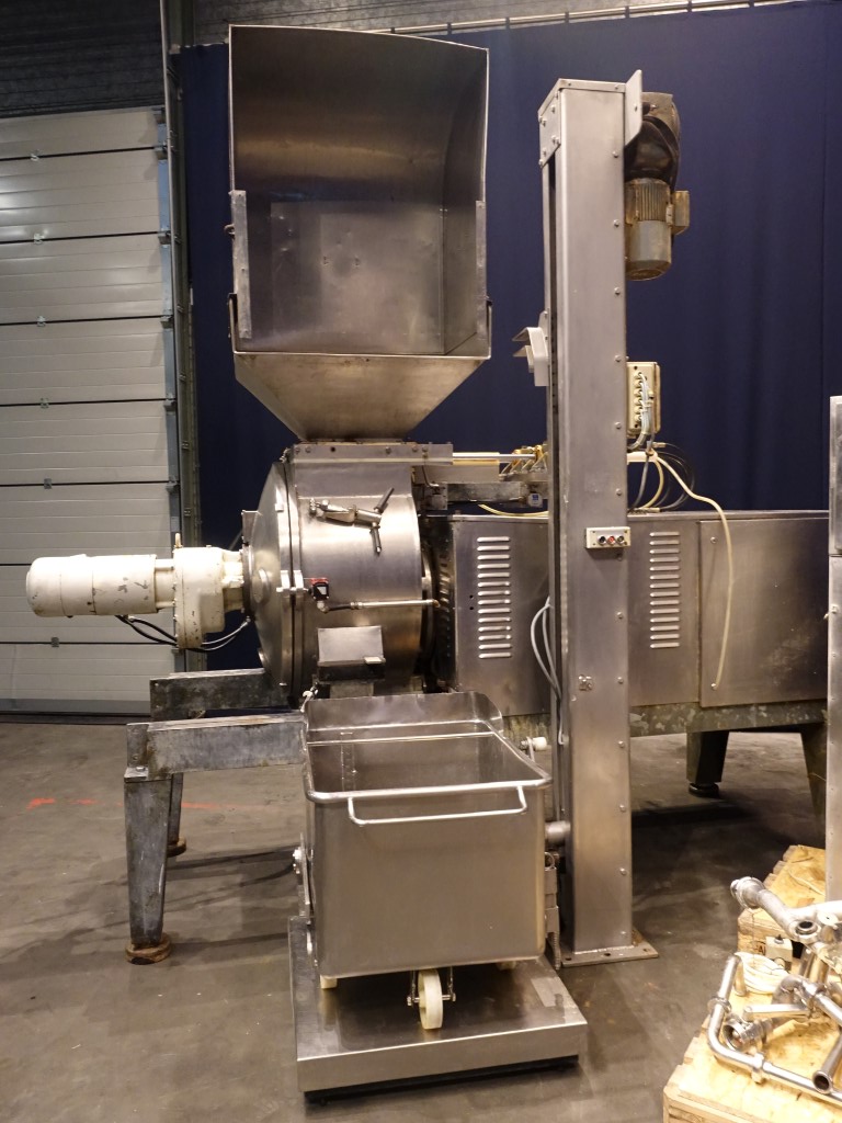 Universal horizontal mixer. The main product bowl and cover are single jackted. Currently no vacuum or steam injection. Connection for temperature sensor in the bowl. With hydraulic unit and cylinder for slide opening top and bottom. The main lid has 2 clamps manual tightening and a hopper on the top inlet. 2 agitators: 1 scraper agitator (30,5 rpm) and 1 mixer, main motor 30 kW - 730 rpm (year 2015). Control cabinet. Including movable outfeed trolley (200 ltr), trolley elevator and weighing plate for trolley. Total dimensions: 300 x 340 x 200 cm.