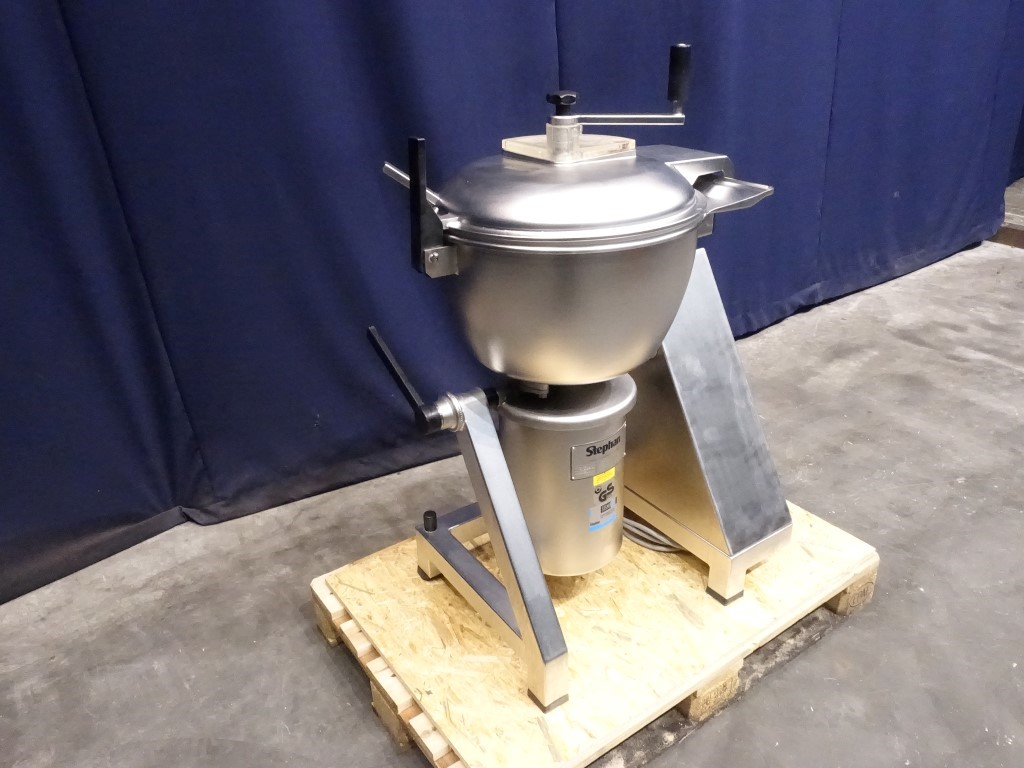 Universal vertical mixer and cutter. The main product bowl, cover and frame are stainless steel. Bowl is single jacketed. No vacuum. The main lid has 1 clamp, manual tightening and a small inspection hatch. 2 Agitators: 1 scraper agitator (manual driven) and 1 mixer knife. Main motor: 4 / 5,5 kW, 1500 / 3000 rpm. Including controls.