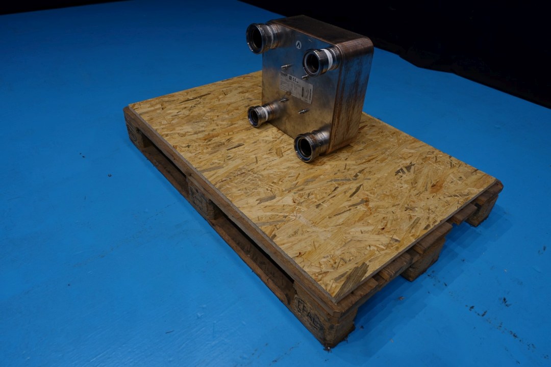 Plate heat exchanger, non-sanitary (PHE). Max pressure: 36-45 bar. Connections: 2 x 2" Din and 2 x 2,5" Din. Current configuration: 1 section, compressed plate package. Connections head: 2 up/2 down. Has been tested Oktober 2024 - no leakage. Dimensions: 37x22x36 (lxwxh) cm - weight: 82 kg.