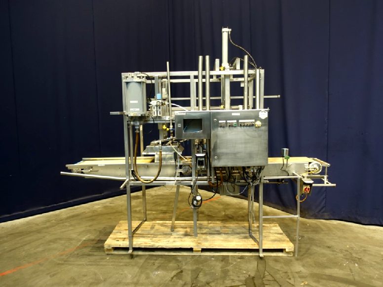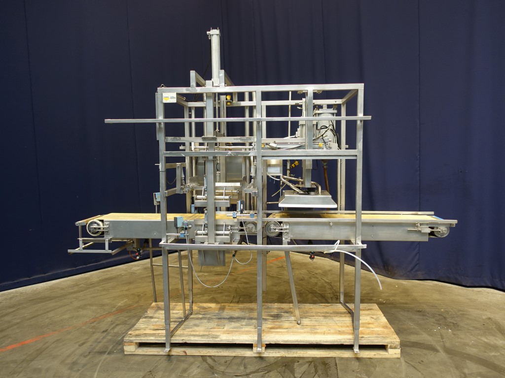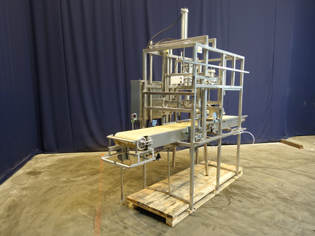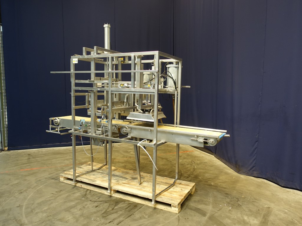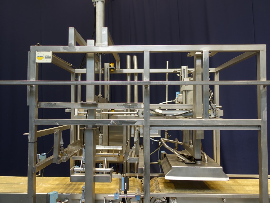 Cheese mould outblow device. Mould size ±38 x 38 cm. Infeed of the mould without lid upside down. First step cheese outblow of the mould. Second step lifting of the mould from the cheese (2 lifting steps to conveyor). Third step push of mould to conveyor (conveyor excluded). Mould outgoing on higher rolling conveyor (excluded), cheese outfeed on belt conveyor. Total dimensions: 3,4 x 1,4 x 2,9 mtr.
