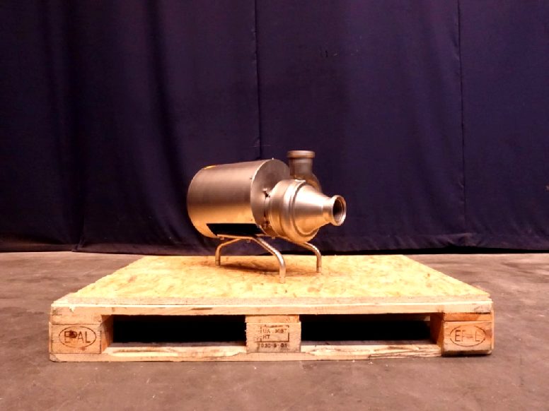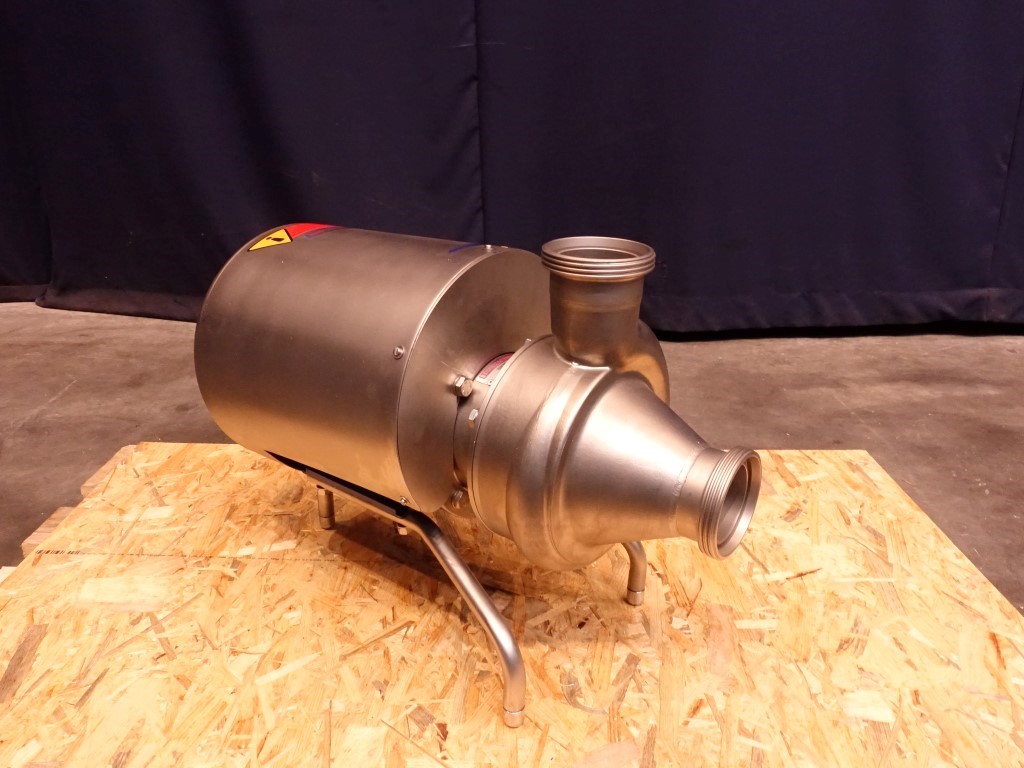 Unused sanitary centrifugal pump. Current motor: 1,5 kW - 3,6 A - 1395 rpm. Impellor diameter: 142 mm. The impellor has the shape of a single-acting endless screw. The shape has been optimized to guarantee the best flow conditions, without damaging the delicate product transferred. Connections: 3 '' / 3'', DIN.