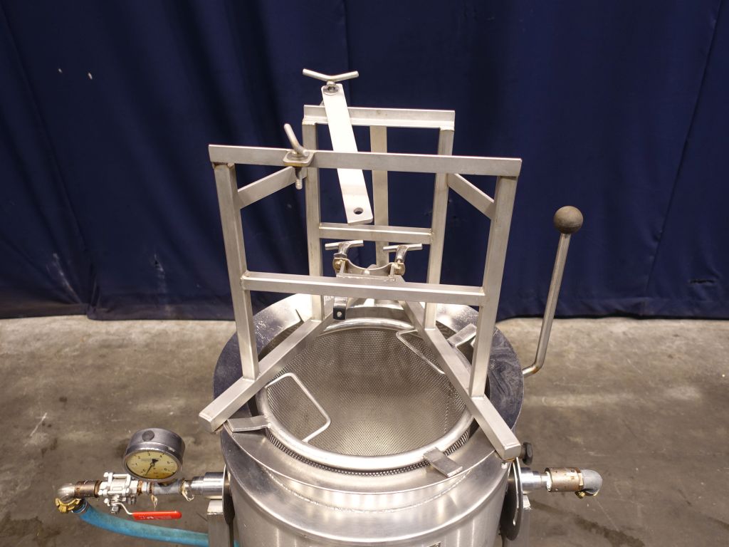Double jacketed. Pressure in jacket 4 bar, max 150 ℃, 6 liter. Tank temperature max 100 ℃. Open Top. Flat to the side. Product outlet 2'' with manual butterfly valve. Tank is turnable in the frame. 4 Feet. Complete with sieve insert and frame for mounting a inlet pipe above the tank. Inside dimensions of tank: diameter 39 cm and height 47 cm. Total dimensions: 60 x 110 x 150 cm.