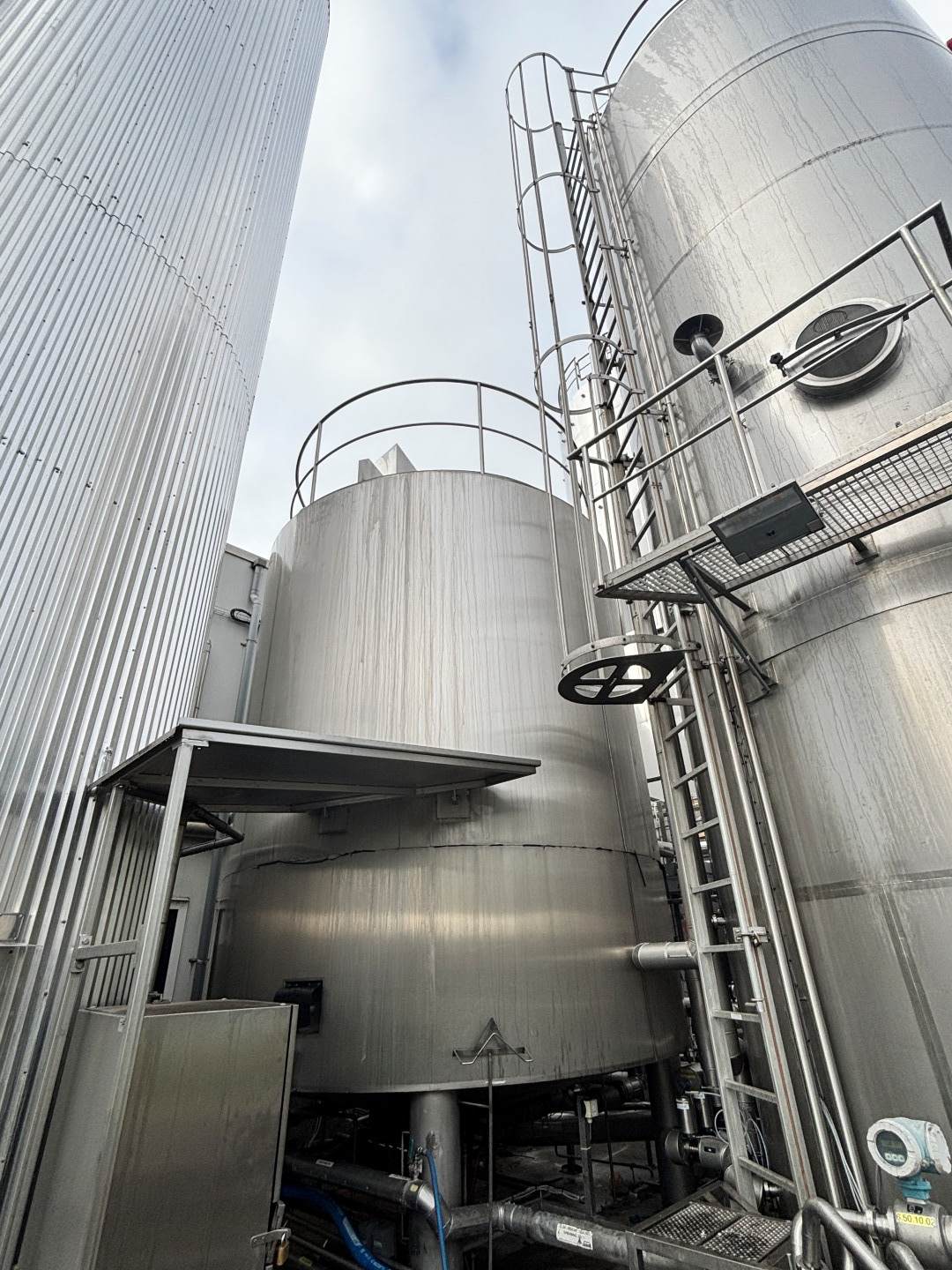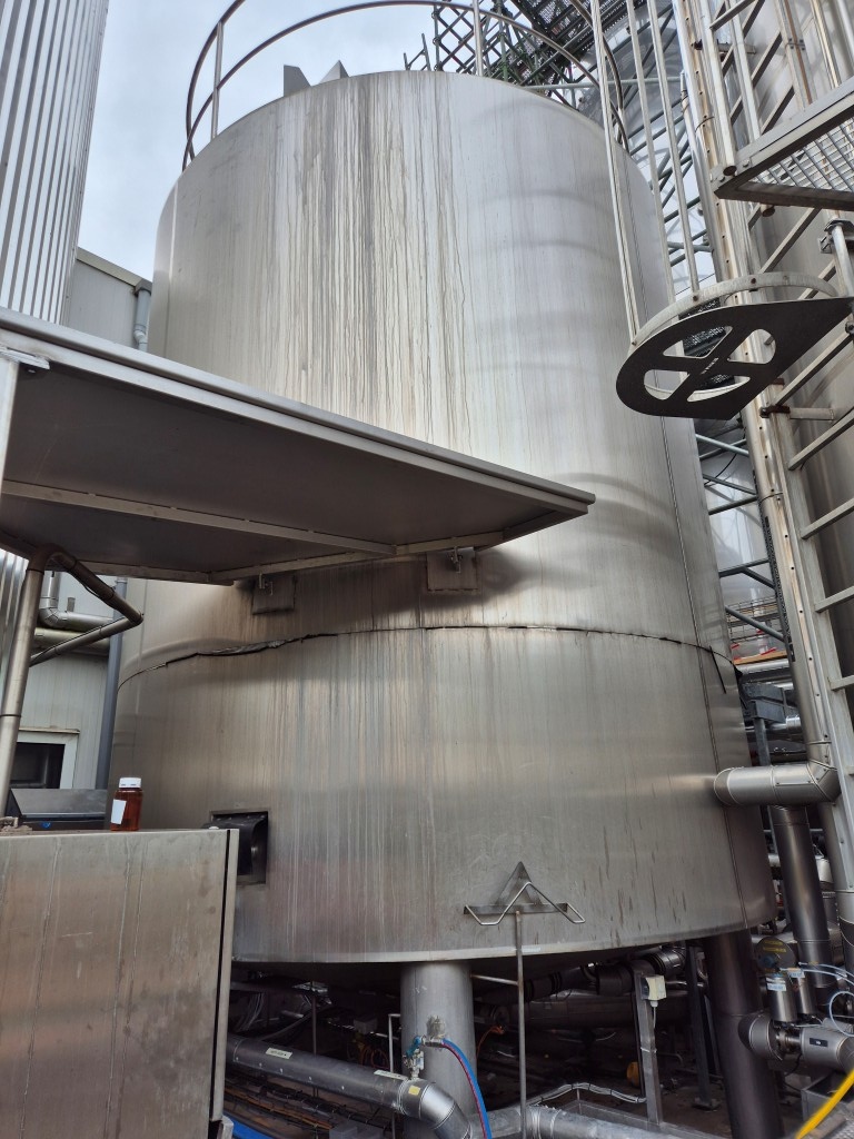 Vertcial double jacketed insulated cream and milk storage and cooling tank. Nominal volume: 35.000 liter. Design pressure: atmosperic (tank) 4 bar (jackets). Design temperature: 100°C (tank and jackets). Topside driven multi-blade agitator, motor: 2,2 kW speed n2: 24 rpm. Insulated, side and bottom. With 2 x cooling sections: bottom 25 ltr and jacket 25 ltr. Previously used for cream storage and cooling via glycol from 8°C -> 4°C; capacity 0,5°C per hour. Product outlet 2,5" Hovap variflow pneumatic tank outlet valve. Outlet height: 80 and 94 cm. With cleanable Sample valve. In bottom 3 x sensor: temperature, pressure and level. High: 1x level. In top: sight glass and breather. 2 CIP spray bowls. Manhole in top, round +/- Ø 50 cm. 4 Adjustable feet. Inside dimensions of tank: Ø 320 cm and cylindrical lenght 386 cm. With stainless steel cage ladder mounted on side. Documentation inculding drawings available. Total dimensions: Ø 349 x 655 cm. Weight: ca. 4.100 kg.