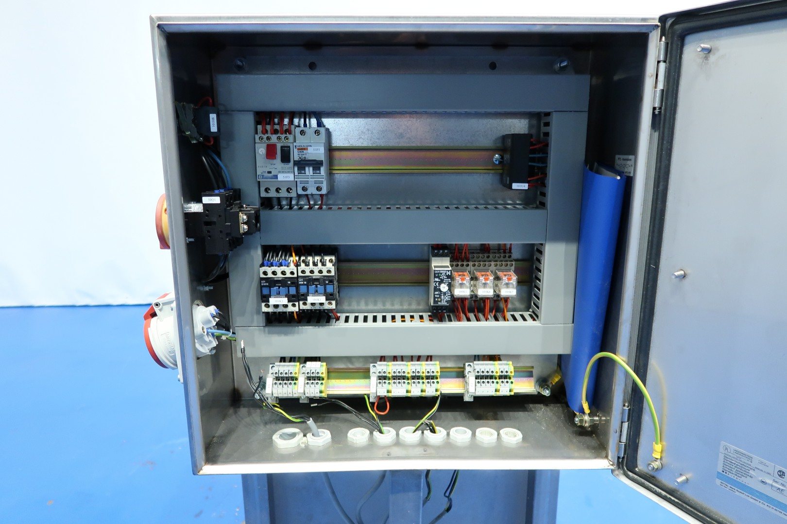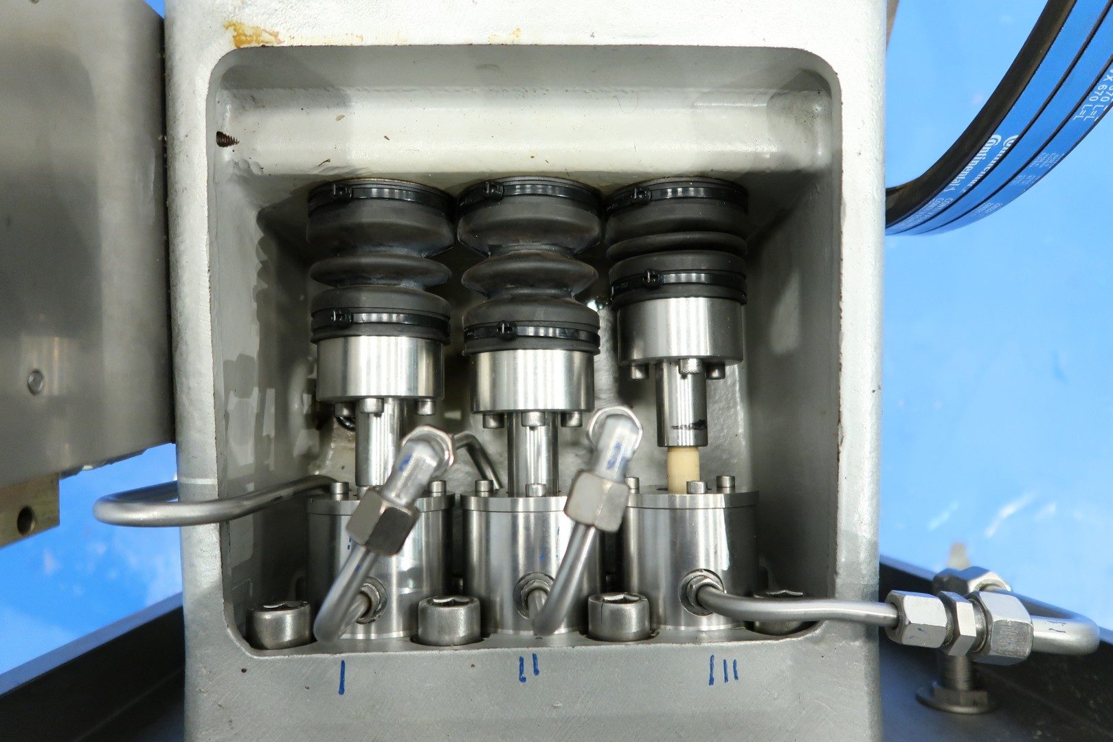High pressure laboratorium homogeniser. 2 Stages with manual hydraulic pressure control, ball valves for viscose products, 3 Ceramic pistons, piston diameter: 14mm and stroke: 25mm. Stainless steel cladded. Motor power: 5,5 kW and maximum pressure up to 300 bar. Built in control panel. Manometer. Flowswitch on cooling water. Total dimensions: 107x56x105 (lxwxh) cm - weight: kg.
