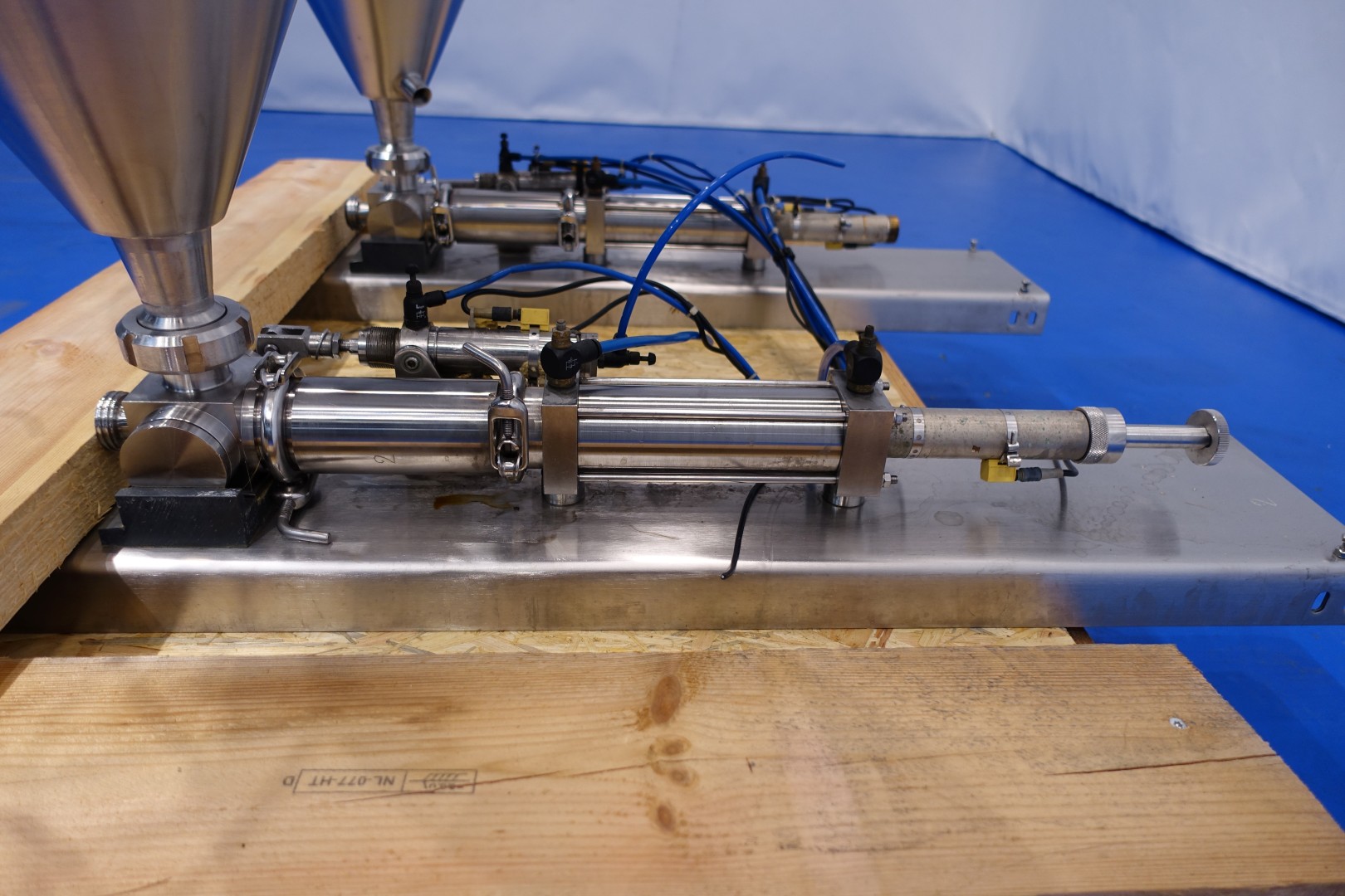 Set of 2 Piston dosers with double jacketed hoppers. Capacity dosers: approximately 100-250ml. 2 x Double jacketed hoppers, each with 1x spray bowl (CIP cleanable). Capacity hopper ca. 95 liter. Spare parts manual available. Total dimensions (lxwxh): 120x107x134 cm - weight: 217 kg.