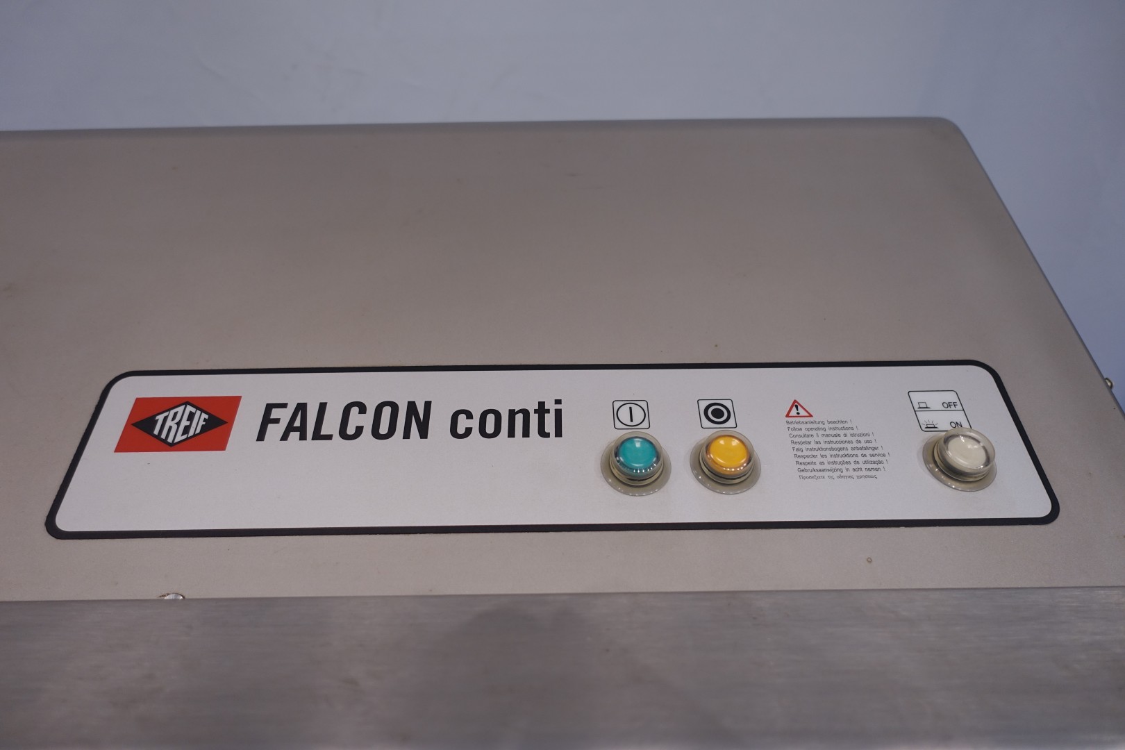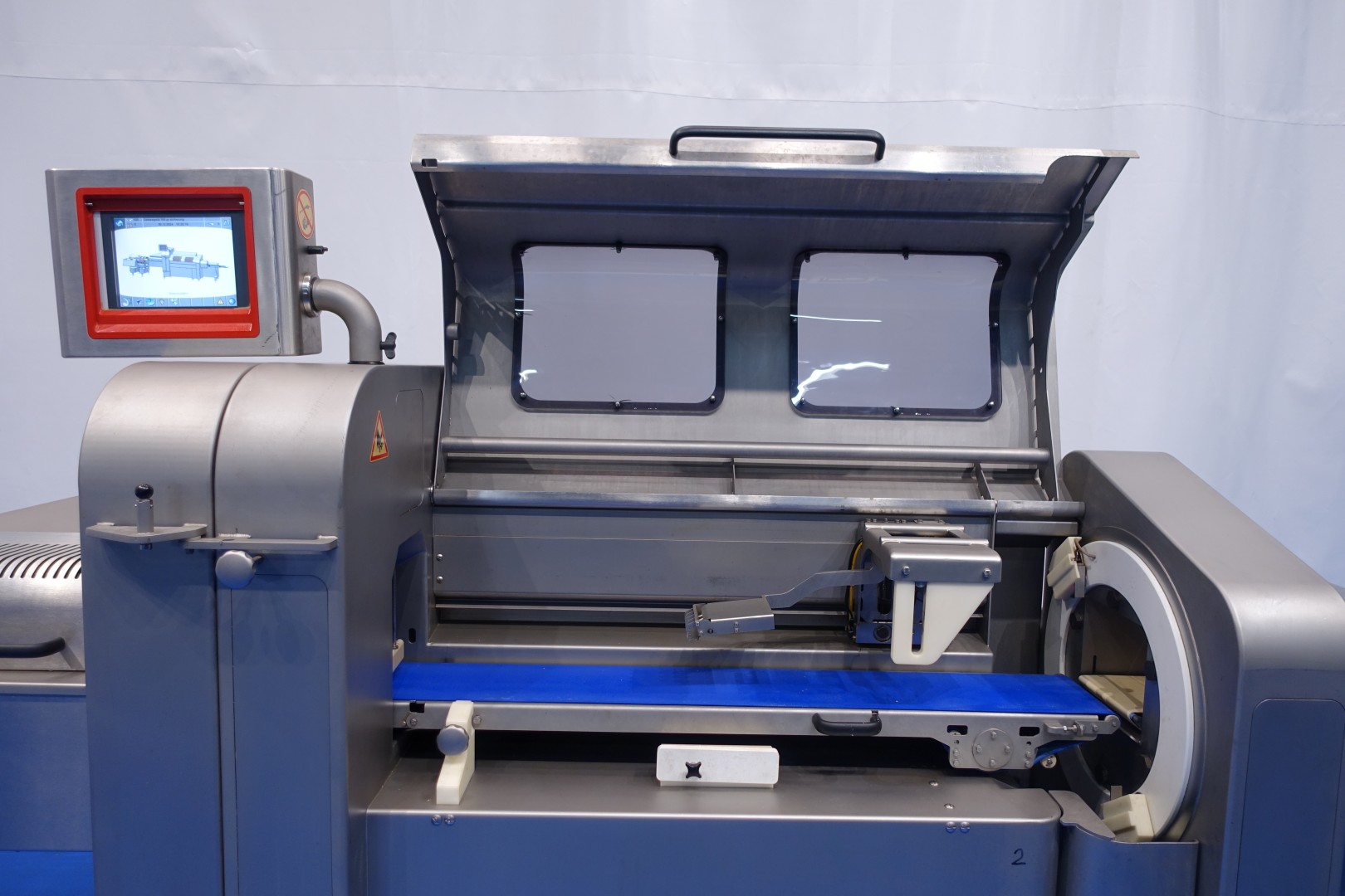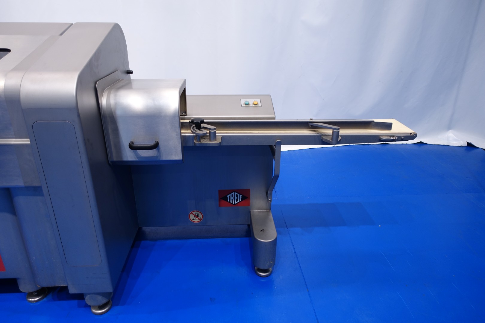 Fully automatic Portion Cutting machine. High-speed cheese or meat cutting / dicing / portion cutting / bread cutting machine by exact weight including checkweigher and sorting station with pusher. The portion is scanned and the machine automatically determines the length of the portion with high throughput. Based on nearly twenty years of experience in the area of cutting precisely weighed portions, TREIF developed the FALCON portion cutter. This Falcon has a digital display with touchscreen. Insertion cross section 260x155 mm / 220x155 mm, single length max. 1000 mm, application down to -4 °C. Power: 22A. Weight: 750kg.
