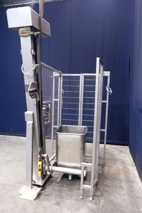 Food bin-norm trolley elevator with safety fence and with 2 x high norm trolley à 200 ltr. Maximum lifting/turning capacity 350 kg. Safety fence with sensors, easy manual button controls. Power: 3x400-230 V / 50 Hz / 10A. Total outside dimensions: 130 x 140 x 290 cm. Has been running with a Stephan 130 cooker machine.